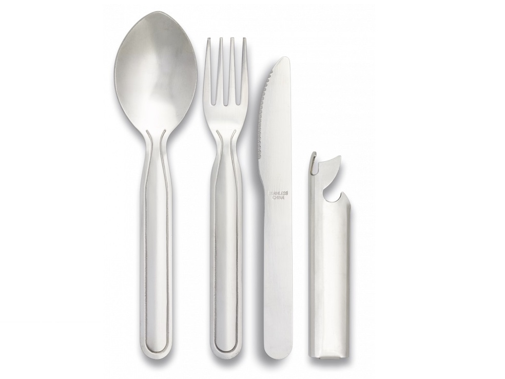 Set obsahuje: Lyžičku, Vidličku, Nôž a Otvárač na konzervy