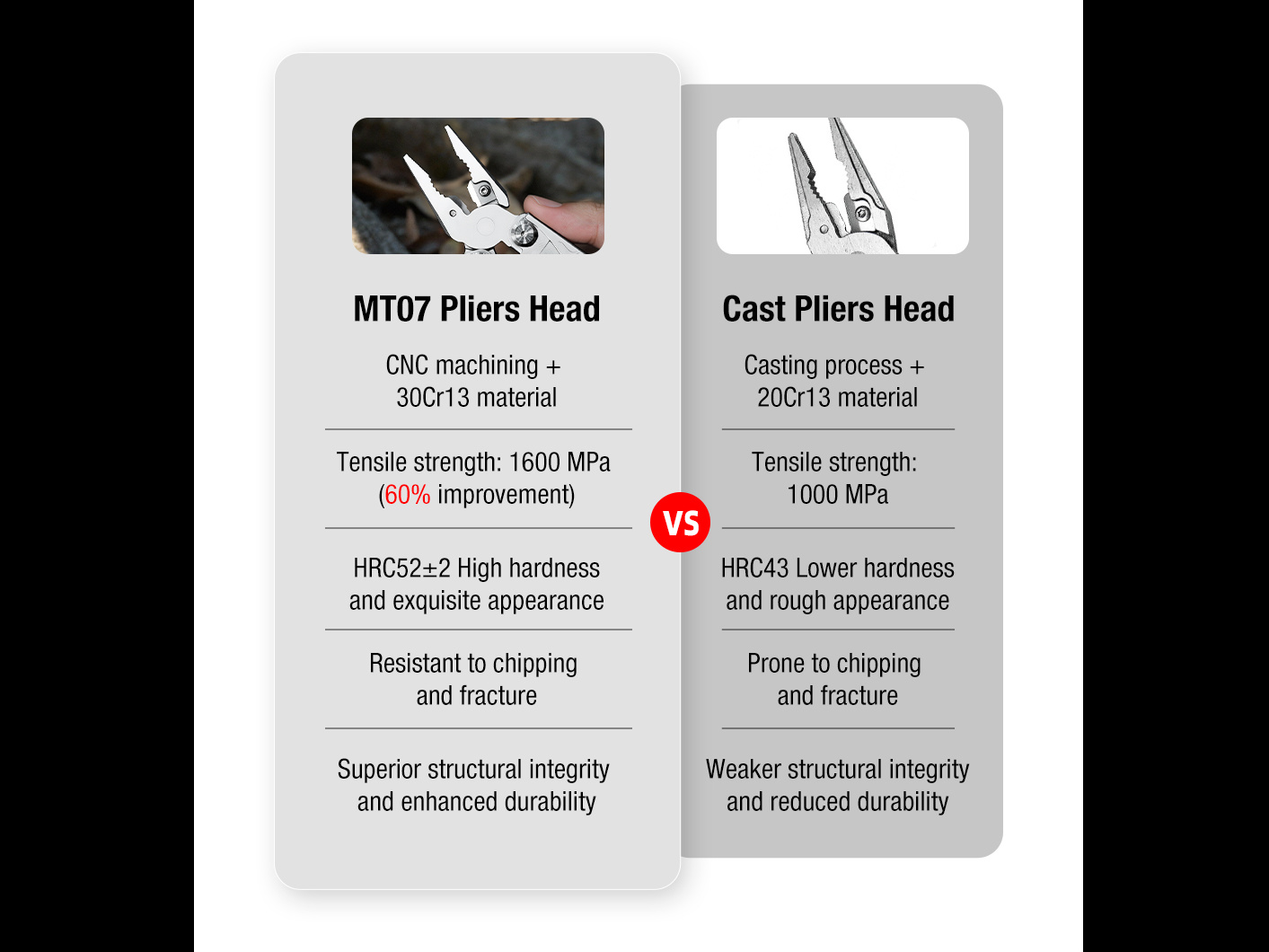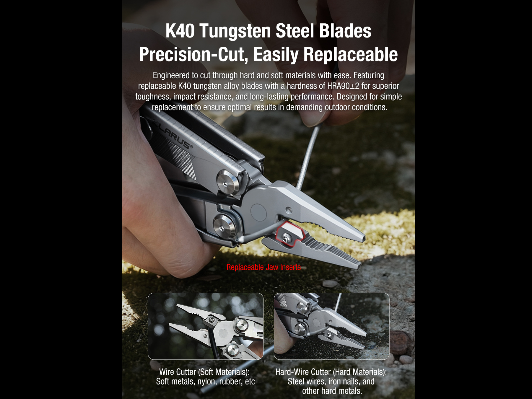 Ich plne CNC obrábané hlavy klieští sú vyrobené z martenzitickej nehrdzavejúcej ocele 30Cr13 tepelne spracovanej na tvrdosť HRC52±2. Tento pokročilý prístup k profesionálnej CNC výrobe poskytuje vynikajúcu povrchovú úpravu, výnimočnú pevnosť a pozoruhodnú odolnosť – odolné voči zlomeniu a opotrebeniu aj pri náročnom používaní. Integrovaný pružinový mechanizmus zaisťuje plynulý automatický návrat pre bezproblémovú opakovanú operáciu. Vymeniteľné volfrámové rezacie čeľuste K40 s tvrdosťou HRA90±2 ľahko prerezávajú tvrdé aj mäkké kovové drôty, elektrické káble, paracord, popruhy a všetky materiály, čím zaisťujú optimálny výkon v najnáročnejších vonkajších a taktických podmienkach.
