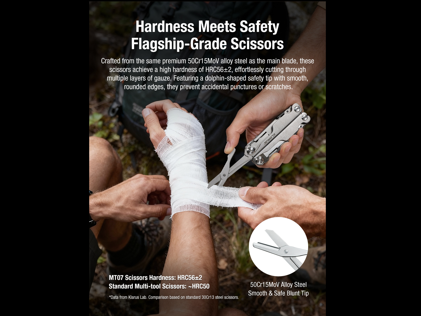 Hlavná čepeľ s dĺžkou 7,5 cm je kovaná z prémiovej legovanej ocele 50Cr15MoV s tvrdosťou HRC56±2, upravená vysoko presným CNC obrábaním a brúsením vodou. Čepeľ tohto noža na prežitie ponúka hladký povrch, vysokú odolnosť proti korózii, odolnú ostrú hranu a všestranný výkon pri strihaní, krájaní, rezbárstve a úprave dreva. Prémiové nožnice vyrobené z rovnakej prémiovej ocele 50Cr15MoV s tvrdosťou HRC56±2 bez námahy prerežú viacero vrstiev gázy, odolné látky, plachty a laná vďaka bezpečnostnej špičke v tvare delfína so zaoblenými hranami, ktorá zabraňuje náhodnému prepichnutiu alebo poškriabaniu počas záchranných operácií alebo núdzovej starostlivosti.