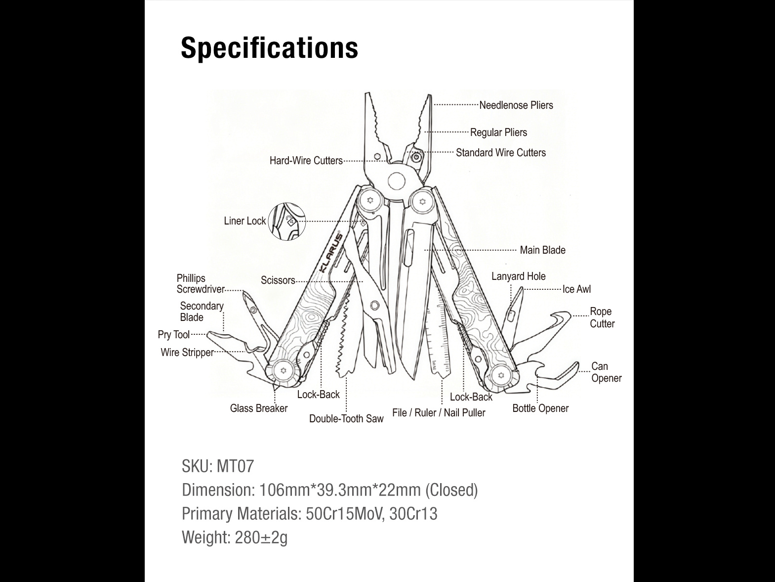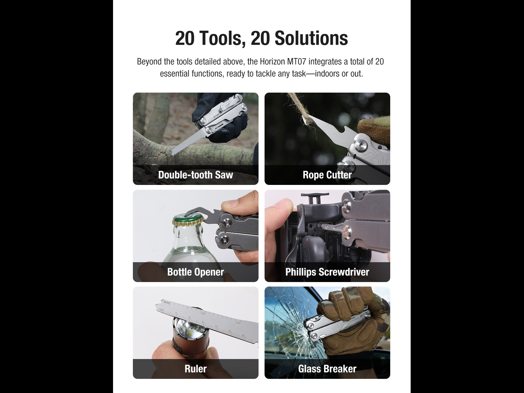 20 integrovaných profesionálnych funkcií: Dvojzubá píla, núdzový rezač lana, otvárač na fľaše, krížový skrutkovač, presné odmerné pravítko, núdzový rozbíjač skla, odolné štandardné kliešte, rezač mäkkého drôtu, rezač tvrdého drôtu, hlavná čepeľ na prežitie, lekárske nožnice, perforačné šidlo, výstružník, pilník na brúsenie, zdvíhač uzáverov, viacúčelový plochý skrutkovač, krížový skrutkovač, otvárač na konzervy, nástroj na kľúčovú dierku a taktická odnímateľná spona