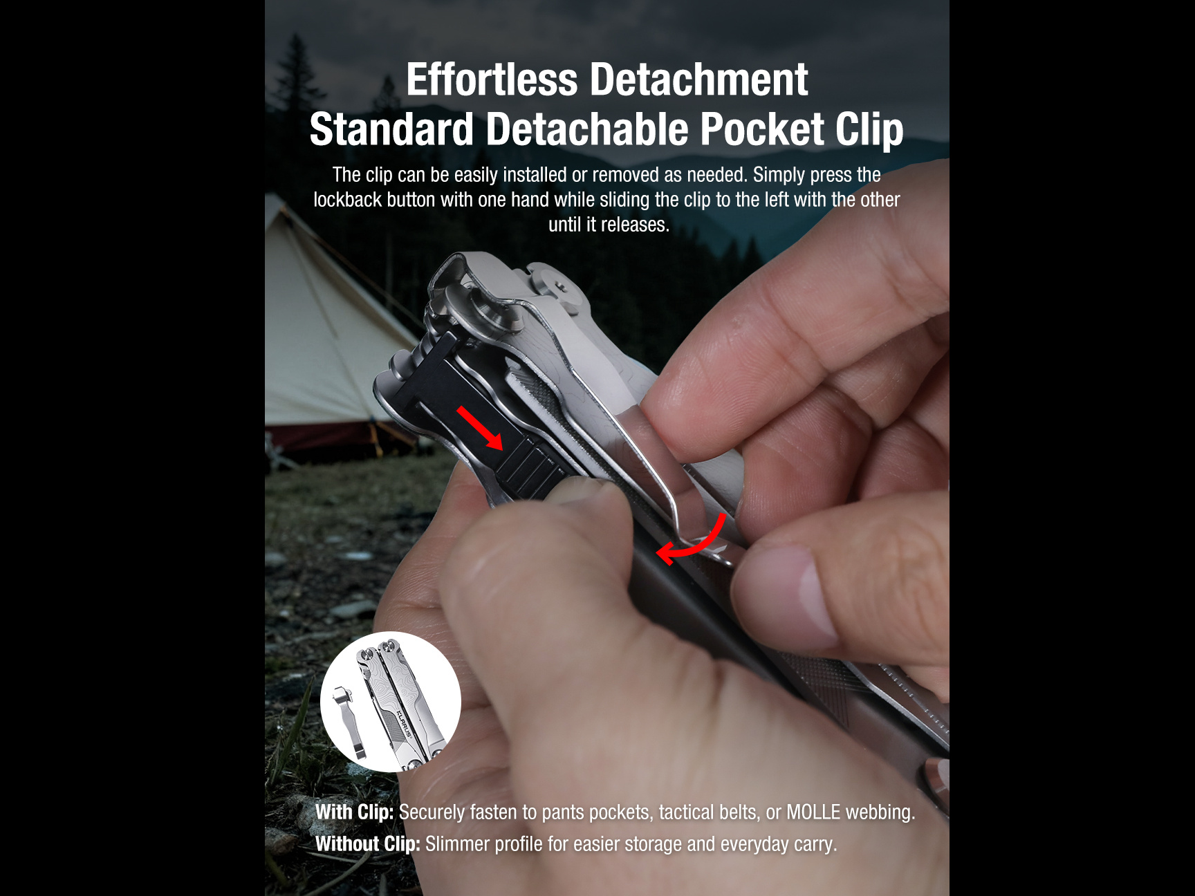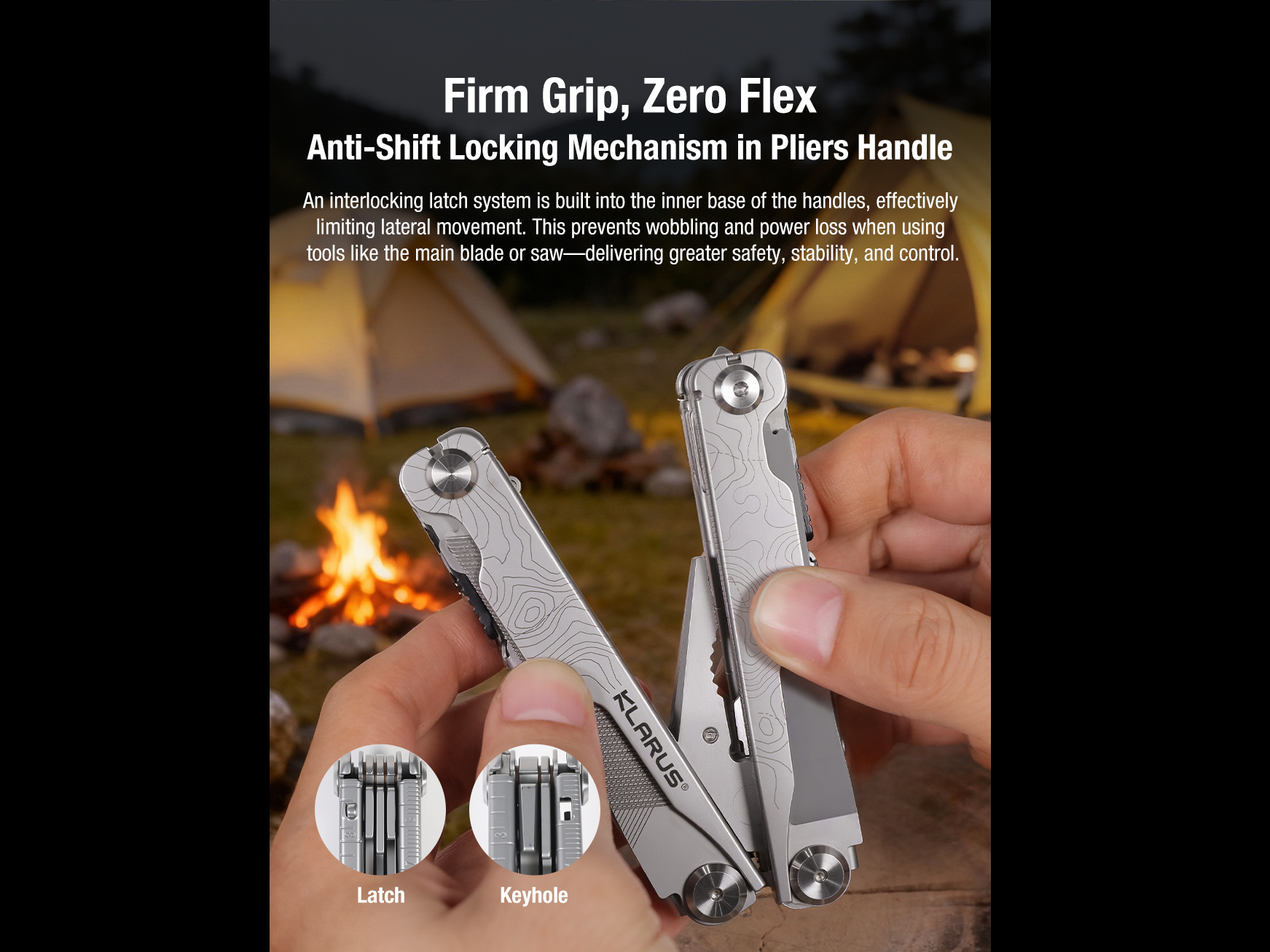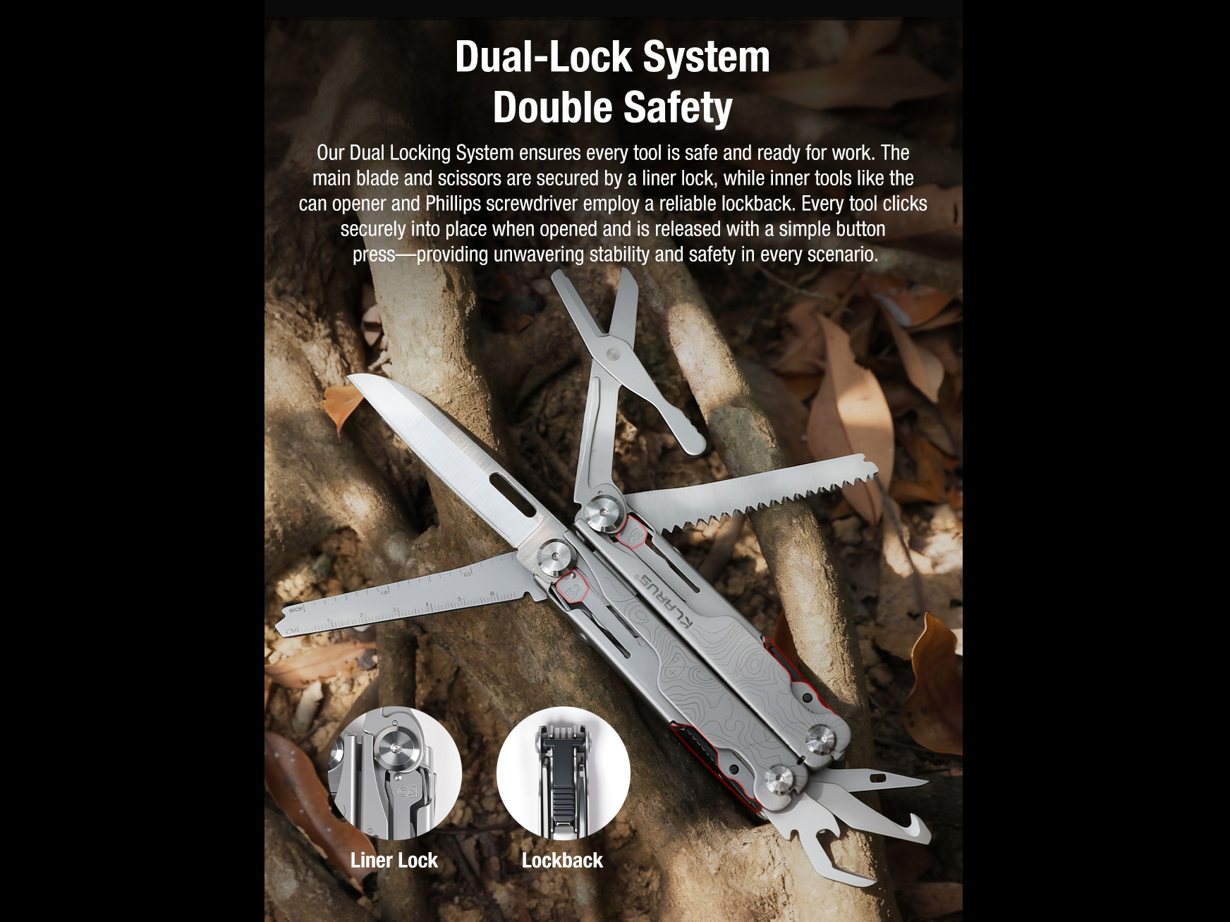 DVOJITÝ BEZPEČNOSTNÝ UZAMYKACÍ SYSTÉM: Systém dvojitého zámku zaisťuje, že každý nástroj je bezpečný a pripravený na prácu. Hlavná čepeľ a nožnice sú zaistené robustným zámkom Liner Lock, zatiaľ čo vnútorné nástroje, ako je otvárač na konzervy a krížový skrutkovač, používajú spoľahlivý mechanizmus spätného zámku. Každý nástroj sa po otvorení bezpečne zacvakne na miesto a uvoľní sa jednoduchým stlačením tlačidla – čo poskytuje neochvejnú stabilitu a maximálnu bezpečnosť vo všetkých scenároch vonkajšieho, taktického alebo profesionálneho použitia.