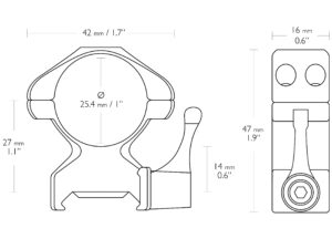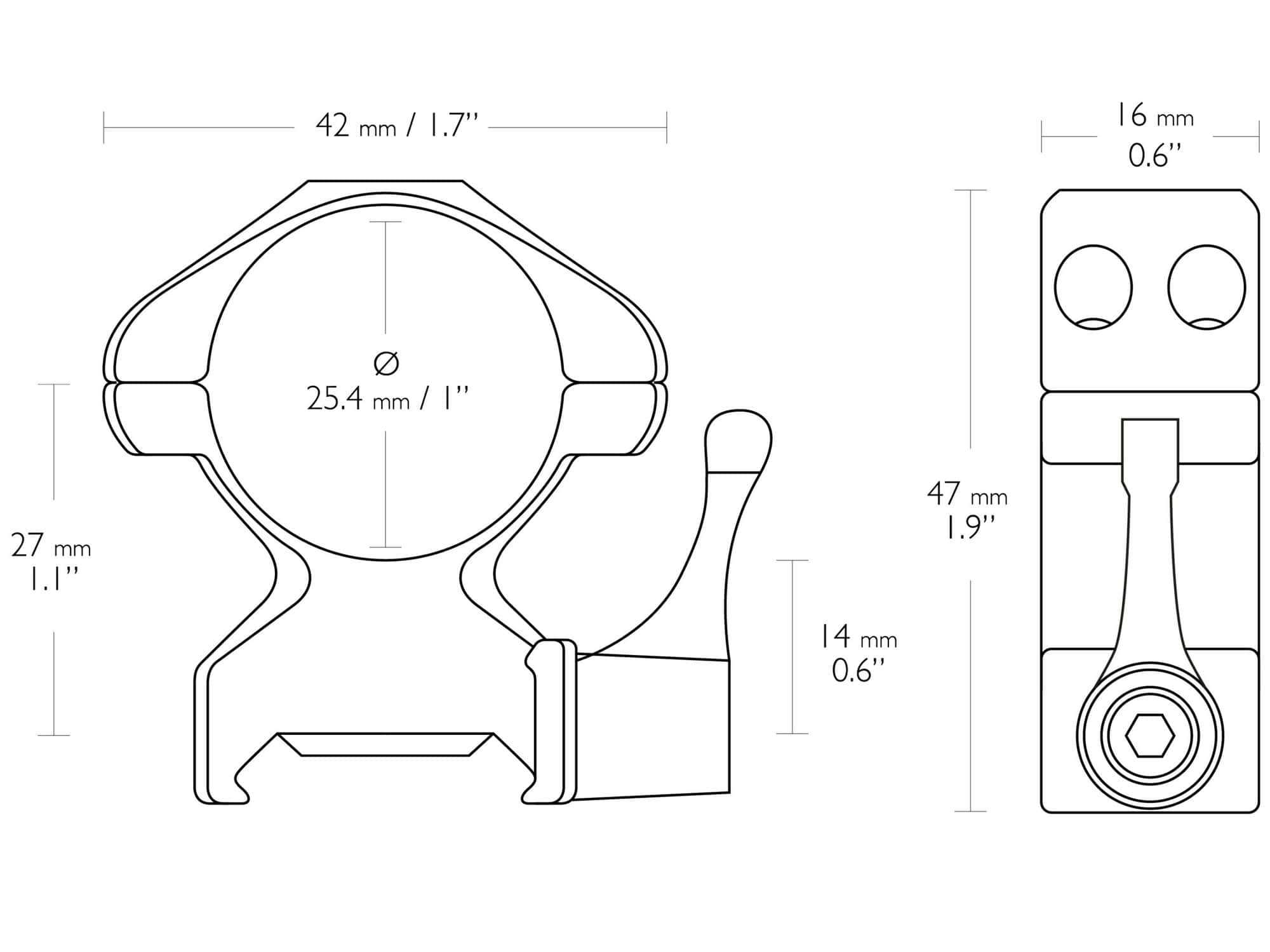 PRECISION STEEL RING MOUNTS 1” 2 PIECE WEAVER HIGH - LEVER (23012) 2 dielna oceľová montáž 25,4mm Vysoká (Weaver) – Páčka. Rýchlo upínací model. Vlastnosti: Dvojité Torx skrutky, ktoré udržia Váš puškohľad pevne na svojom mieste. Navrhnuté pre uchytenie na Weaver/Picatiny koľajničku. Kvalitná oceľová konštrukcia. Prevedenie – Dva kusy. Veľkosť otvoru (Priemer) – 25,4mm / 1”. Výška – High (Vysoká). Základňa / kolajnička – Weaver. Uchytenie na základňu – Rýchloupínacia páčka. Uchytenie vrchnej časti – Dvojité Torx skrutky. Vnútorná páska – Nie. Vysúvací dorazový kolík – Nie. Výška – 47mm. Váha – 190g.