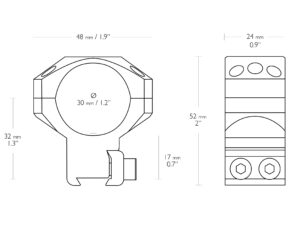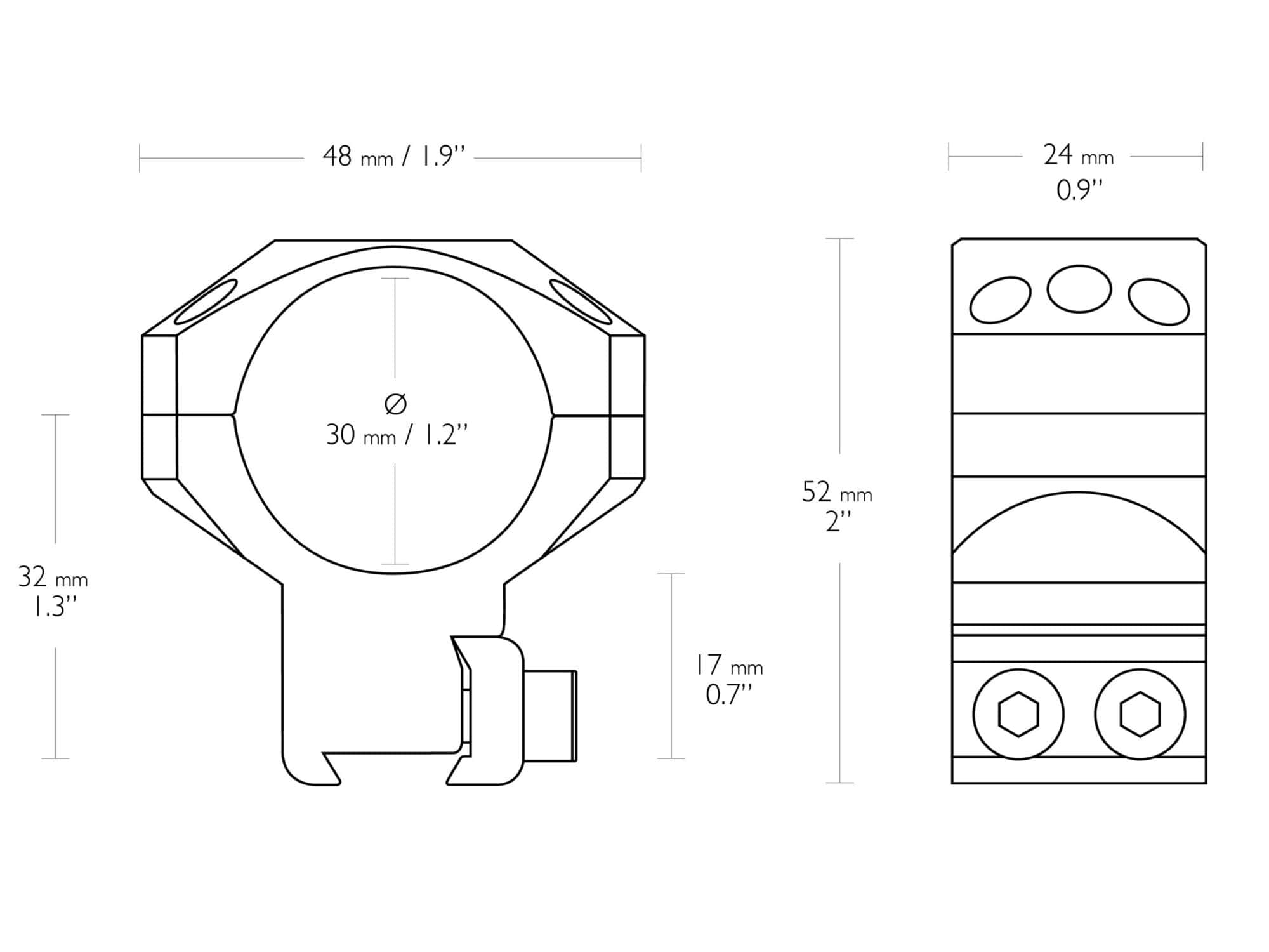 TACTICAL RING MOUNTS 30mm 2 PIECE 9-11mm HIGH (24107) 2 dielna hliníková montáž 30mm Vysoká (9-11mm / 3/8”). Vlastnosti: Trojité Torx skrutky, ktoré udržia Váš puškohľad pevne na svojom mieste. Navrhnuté pre uchytenie na 9-11mm / 3/8” základňu. Matný čierny eloxovaný vysoko kvalitný hliník. Vnútorná výstelka zabraňuje značeniu a poškodeniu. Obojstranná bočnica pre koľajnice 9-11 mm alebo 3/8 ". Prevedenie – Dva kusy. Veľkosť otvoru (Priemer) – 30mm. Výška – High (Vysoká). Základňa / kolajnička – 9-11mm / 3/8” rybina. Uchytenie (základňa / vrchná časť) – Dvojité / Trojité Torx skrutky. Vnútorná páska – Áno. Vysúvací dorazový kolík – Áno. Výška – 52mm. Váha – 131g. Kompatibilná s: 22154 HAWKE Picatinny Ring Caps (30mm, triple screw).