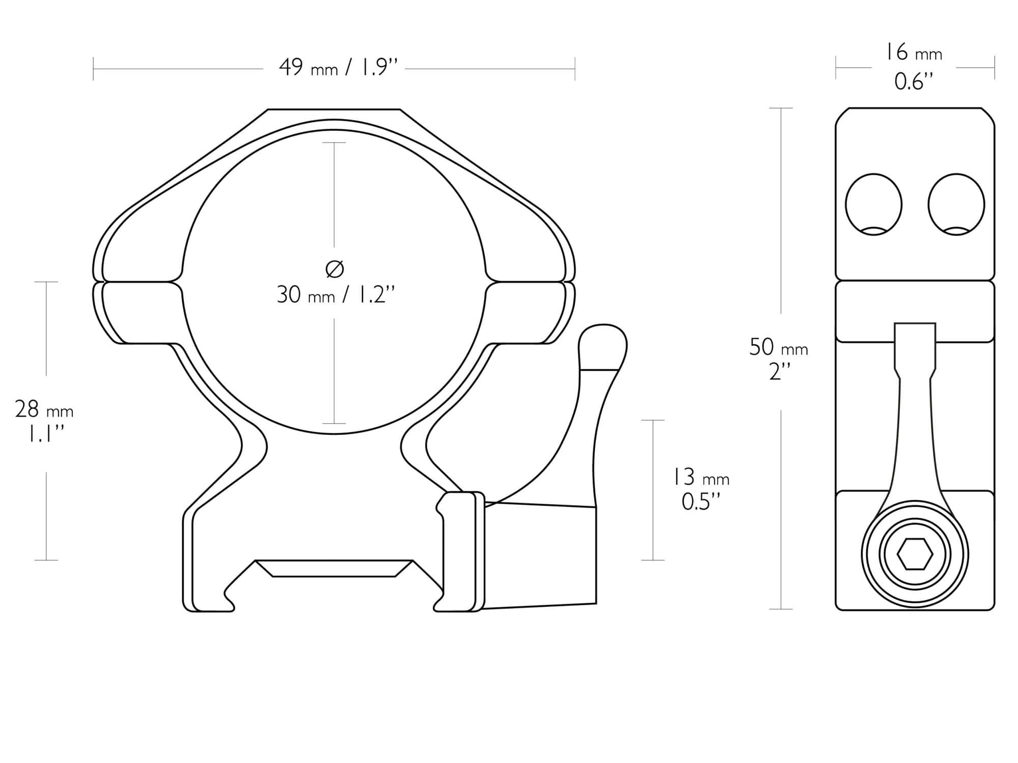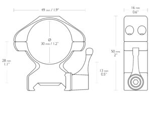 PRECISION STEEL RING MOUNTS 30mm 2 PIECE WEAVER HIGH – LEVER (23017) 2 dielna oceľová montáž 30mm Vysoká (Weaver) – Páčka. Rýchlo upínací model. Vlastnosti: Dvojité Torx skrutky, ktoré udržia Váš puškohľad pevne na svojom mieste. Navrhnuté pre uchytenie na Weaver/Picatiny koľajničku. Kvalitná oceľová konštrukcia. Prevedenie – Dva kusy. Veľkosť otvoru (Priemer) – 30mm. Výška – High (Vysoká). Základňa / kolajnička – Weaver. Uchytenie na základňu – Rýchloupínacia páčka. Uchytenie vrchnej časti – Dvojité Torx skrutky. Vnútorná páska – Nie. Vysúvací dorazový kolík – Nie. Výška – 50mm. Váha – 196g.