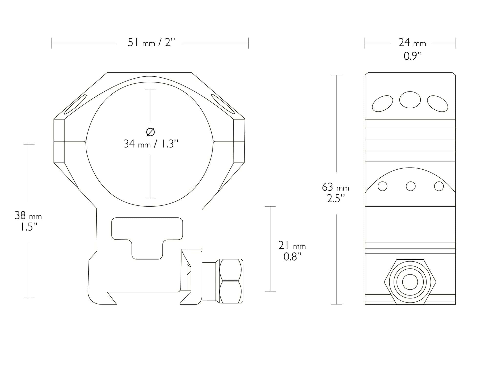 TACTICAL RING MOUNTS 34mm 2 PIECE WEAVER HIGH (24120) 2 dielna oceľová montáž 34mm Vysoká (Weaver). Šesťhranný maticový model. Vlastnosti: Trojité Torx skrutky, ktoré udržia Váš puškohľad pevne na svojom mieste. Matný čierny eloxovaný vysoko kvalitný hliník. Vnútorná výstelka zabraňuje značeniu a poškodeniu. Prevedenie – Dva kusy. Veľkosť otvoru (Priemer) – 34mm. Výška – High (Vysoká). Základňa / kolajnička – Weaver. Uchytenie (základňa / vrchná časť) – Dvojité / Trojité Torx skrutky. Vnútorná páska – Áno. Vysúvací dorazový kolík – Áno. Výška – 63mm. Váha – 172g.