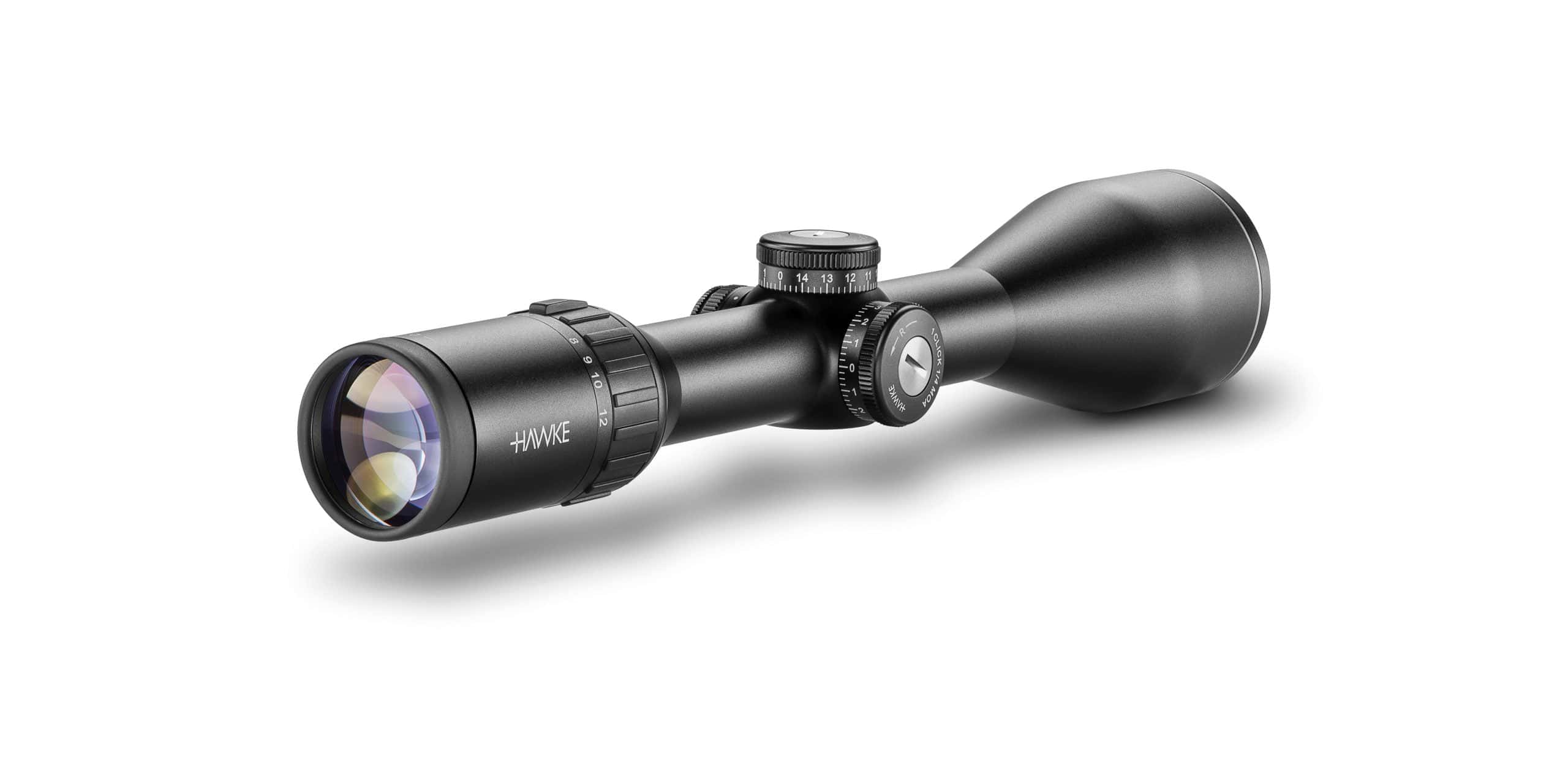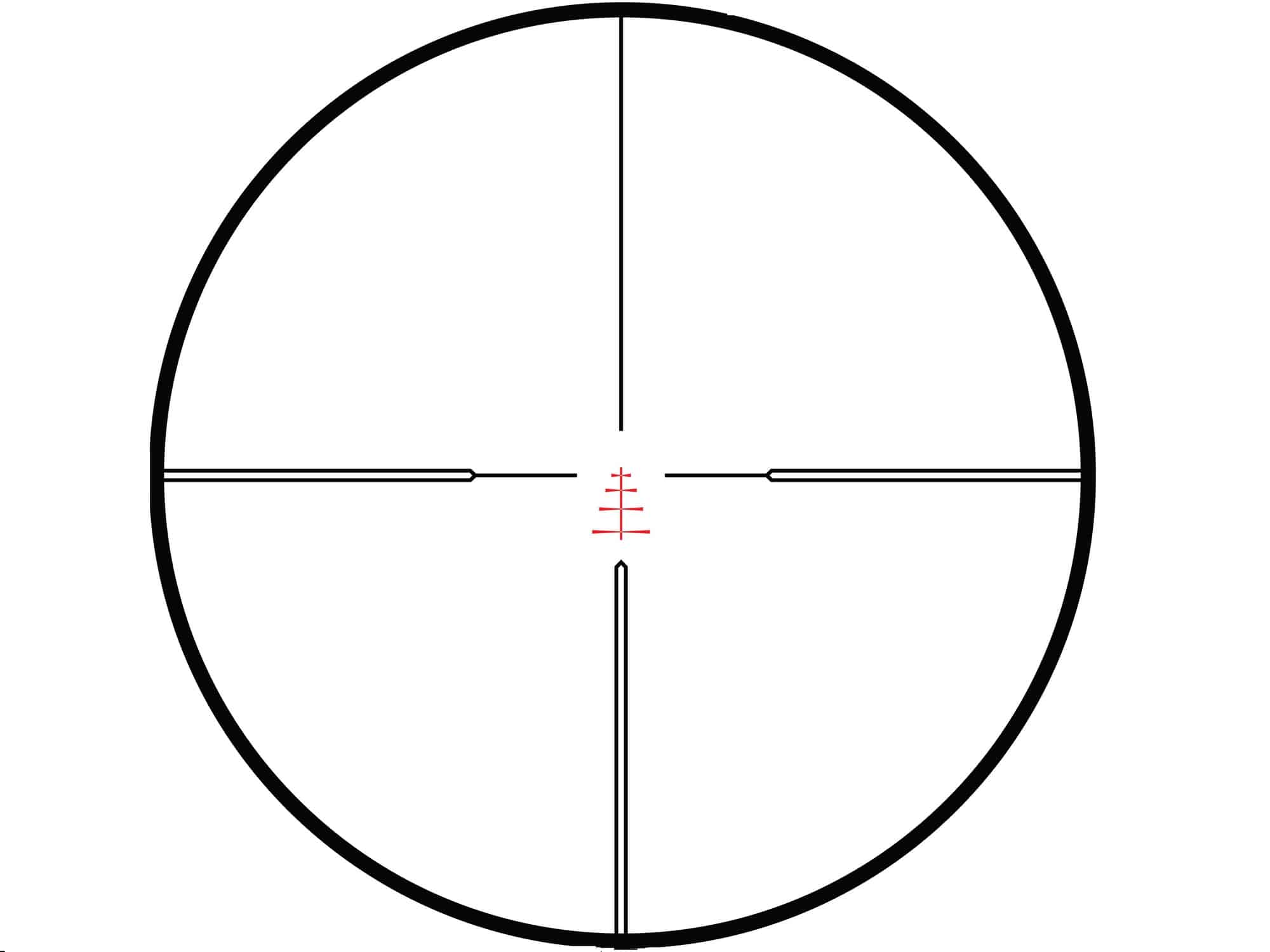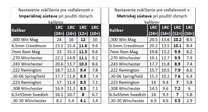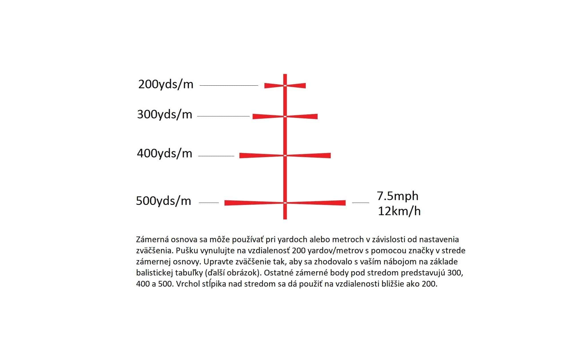 Zámerná osnova LRC (12x) – Pri práci s trajektóriou vašich nábojov, LRC (12x) zámerná osnova (výlučne od firmy Hawke) poskytuje vhodné cieľové body pri streľbe alebo love s použitím centrefire nábojov na Dlhú Vzdialenosť. Zámerná osnova je špeciálne navrhnutá okolo balistických profilov centrefire nábojov, čo umožňuje dosiahnuť oveľa väčšiu presnosť pri mierení nad/pod. LRC (12x) zámerná osnova je vyleptaná do skla a obsahuje podsvietený cieľový bod s horizontálnymi značením pre lepšiu presnosť, ktoré vyniká proti listovým a tmavým pozadím. Cieľové body zámernej osnovy sú navrhnuté tak, aby sa medzery zvyšovali. Toto presnejšie predstavuje pokles trajektórie strely (čím ďalej guľka cestuje, tým rýchlejšie guľka padá). Všetko čo potrebujete urobiť, je upraviť nastavenie zväčšenia tak, aby zodpovedalo vašej balistike (nábojov, ktoré používate). Zámerná osnova sa môže používať pri yardoch, alebo metroch v závislosti od nastavenia zväčšenia. Nastreľte/Vynulujte pušku na vzdialenosť 200yardov/metrov s použitím cieľového bodu umiestneného v strede zámernej osnovy. Nastavte zväčšenie tak, aby zodpovedalo hodnotám pre daný typ náboja (uvedené v tabuľke pre dané typy nábojov). Cieľové body pod stredom predstavujú vzdialenosti 300, 400 a 500. Horná časť stĺpika nad stredom môže byť použitá pre vzdialenosti bližšie ako 200.