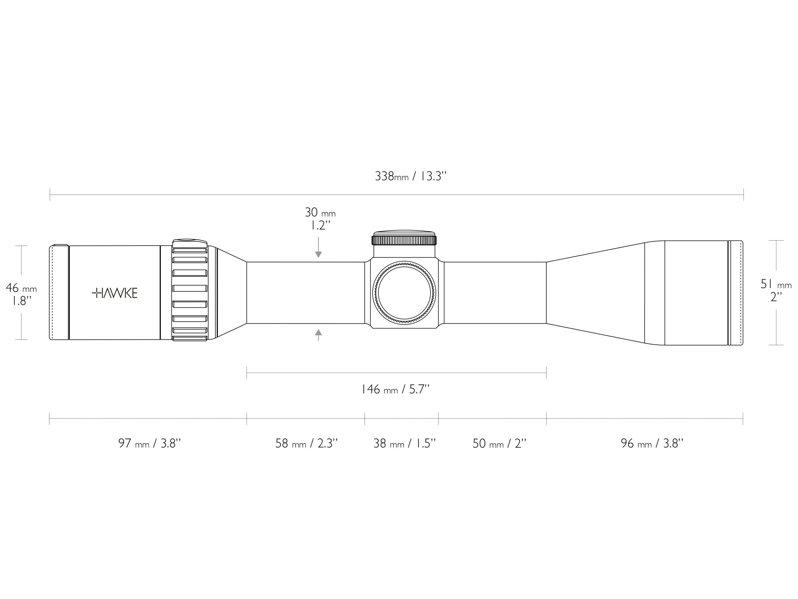 Zámerná osnova LRX – Hunter FD (18x) – Podobne ako stále populárna zameriavacia osnova LR Dot od spoločnosti Hawke, aj zameriavacia osnova LRX-Hunter ponúka čistú poľovnícku zameriavaciu osnovu s extra zameriavacími bodmi pre dlhé zameranie, ktoré sú založené na balistických rozstupoch populárnych nábojov so stredovým zápalom. LRX-Hunter má tiež ďalšie stranové úchyty rozmiestnené 2 MOA od seba, ktoré pomáhajú v náročných podmienkach.