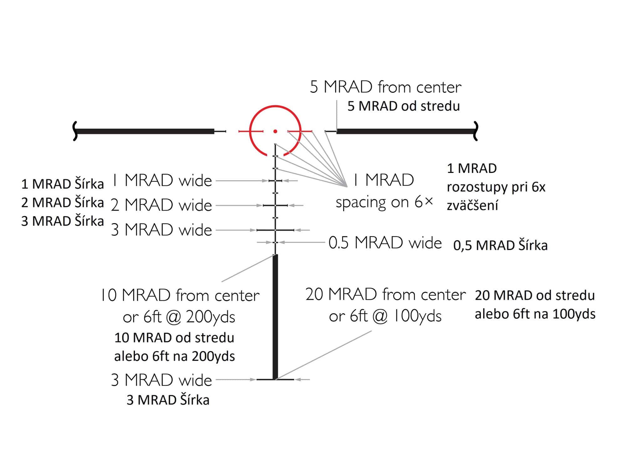 Pri 6x zväčšení, značky zámernej osnovy predstavujú jednotku uhla nazývanú MRAD (miliradián) alebo skrátene „Mil“.