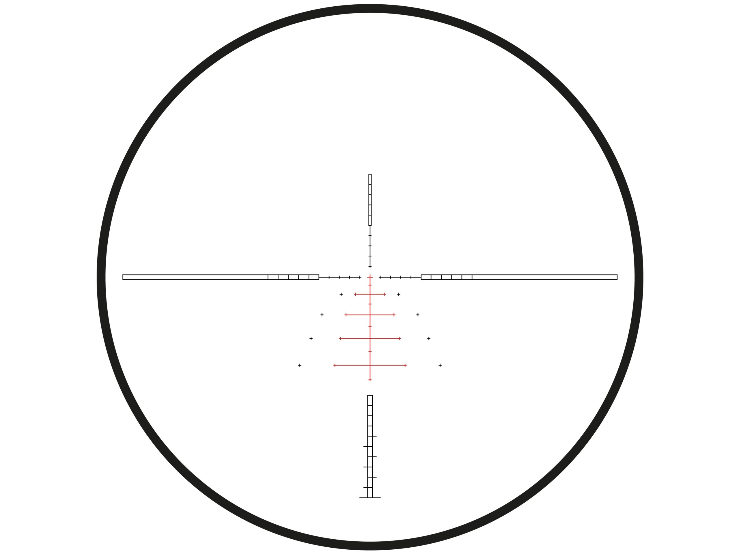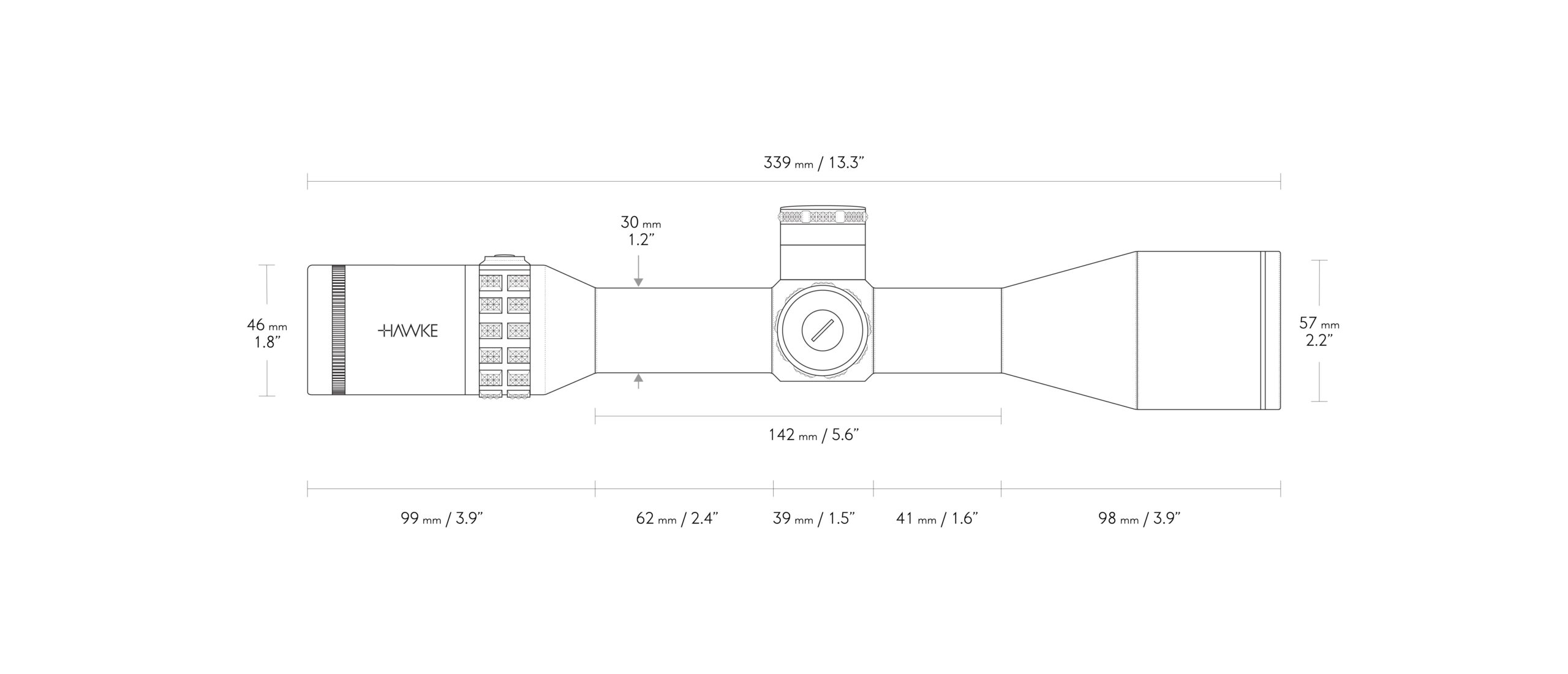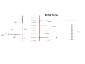 Zámerná osnova SR Pro II – Zámerná osnova SR Pro II obsahuje duté obdĺžniky (hore a po stranách), tenké kríže smerom dole a ďalšie horizontálne body. Čiary a bodky môžu byť tiež použité aj pre určenie vzdialenosti. Pri práci s trajektóriou vašich nábojov, zámerná osnova SR Pro II (výhradne od Hawke) vám zaručene poskytne použiteľné cieľové body bez ohľadu na váš kaliber. Zámerná osnova obsahuje duté obdĺžniky, zátvorky pre zistenie vzdialenosti, podsvietený centrálny bod a pre podržanie nad cieľové body s horizontálnymi čiarkami a bodkami. Prvotriedna konštrukcia vhodná pre extrémne streľby. Zámerné body na spodnom stĺpiku zámernej osnovy sú navrhnuté so zväčšujúcimi sa medzerami. To presnejšie znázorňuje smer poklesu trajektórie strely; čím ďalej strela letí, tým rýchlejšie padá. Pri 8-násobnom zväčšení sú duté lišty na okraji zámernej osnovy rozdelené na segmenty, z ktorých každý predstavuje 3,6 palca na 100 yardoch (to sa rovná 100 mm na 100 m, tiež známe ako 1 MRAD).