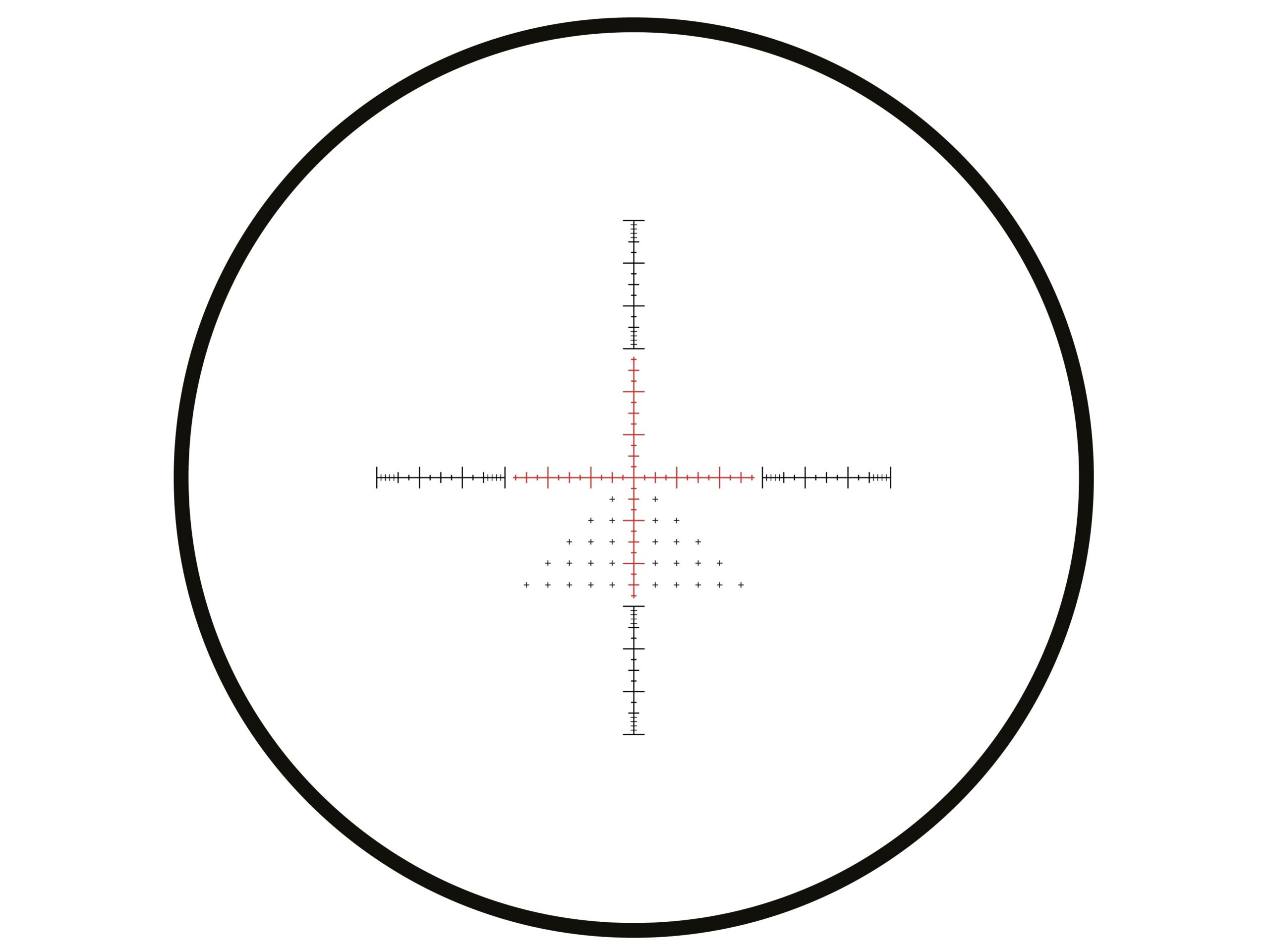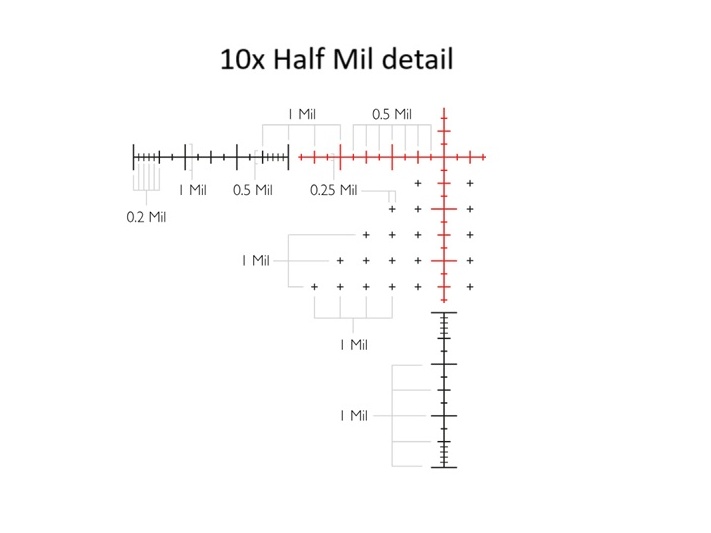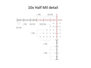 Zámerná osnova 10x Half Mil Dot – Zámerná osnova 10x Half Mil Dot obsahuje presné mil (1 mil. (miliradián) = 3,44 MOA) rozostupy pri 10x zväčšení. Obsahuje bodky a čiarky na polovičnom (half) mil rozostupe až do 5 mil všetkými smermi., zabezpečujúc, že máte zámerný bod vždy k dispozícii. Do skla vyleptaná zámerná osnova s plne plávajúcim dizajnom. Ďalšou výhodou zámernej osnovy 10x Half Mil Dot je okrem segmentov v mil. rozostupoch aj ďalšie 0,2 mil. rozostupy dutých tyčí (obdĺžnikov po okrajoch), ktoré môžu byť použité pre presné vzdialenostné nájdenie cieľov.