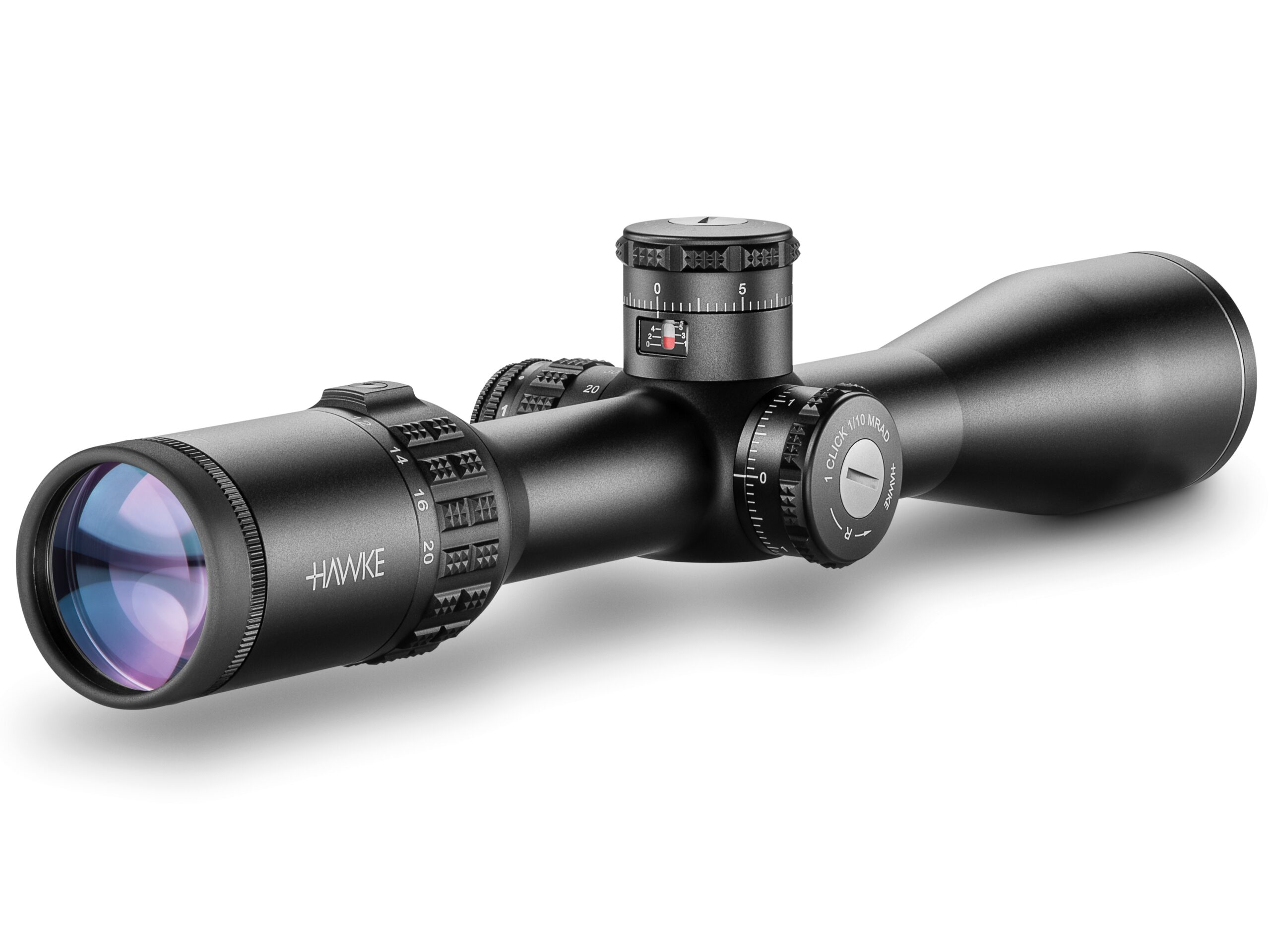 Typ vežičiek: 1/10 MRAD (predstavuje 1 klik) odkryté, uzamykateľné a resetovateľné vežičky s kontrolným okienkom.