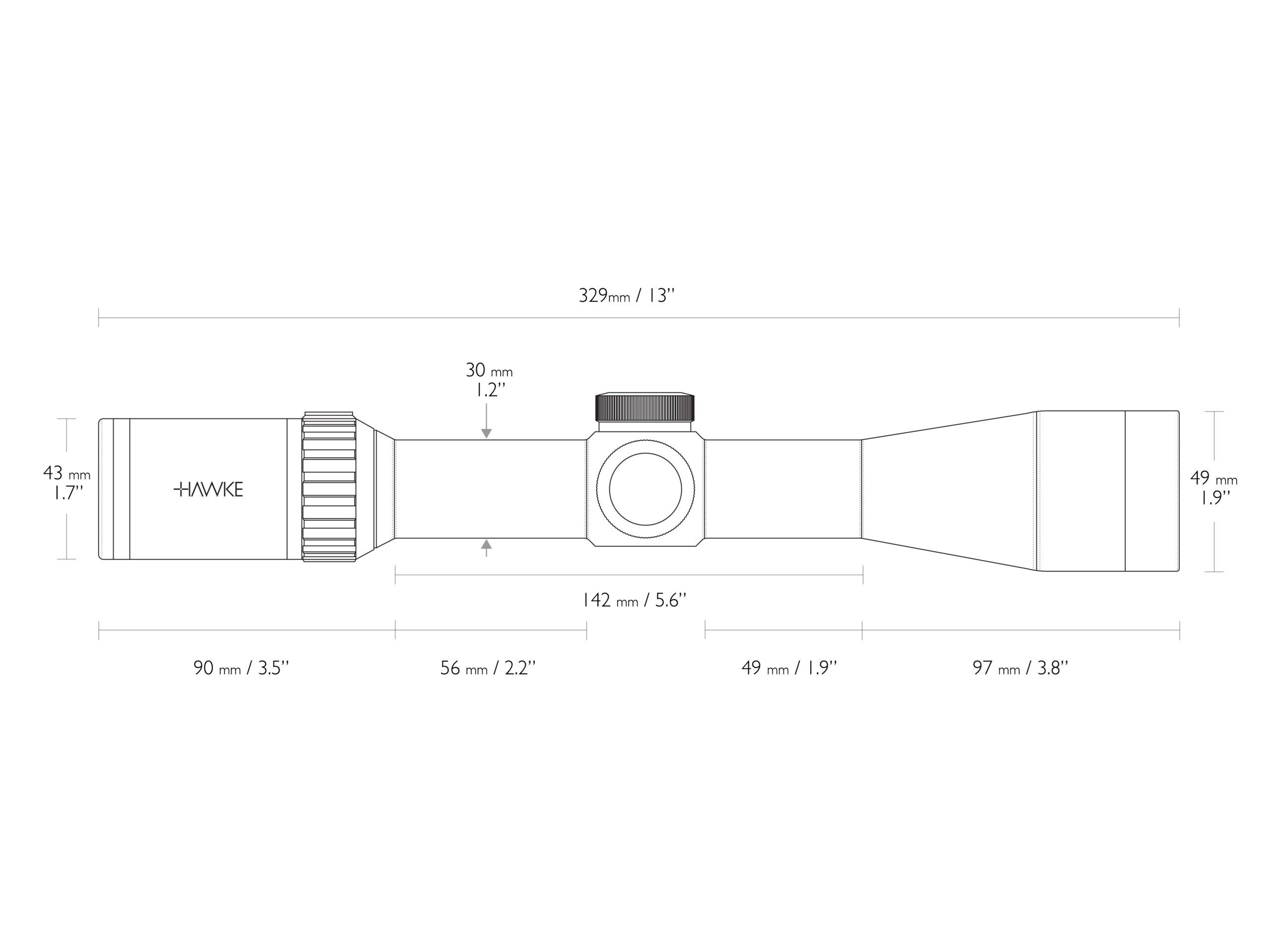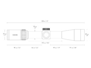 Zámerná osnova L4A Dot (2 MOA) – Je variantom klasickej zámernej osnovy L4, L4A Dot využíva dizajn s viac otvorený priestorom medzi vonkajšími bodmi pre väčšiu viditeľnosť cieľa pri mierení. 30“ priestor medzi stredom po hranu hrubšieho stĺpika na 100yds pri 4x zväčšení. Toto je ekvivalent (=) 83cm na 100m. Veľkosť bodky je 2 MOA. Viac k zámernej osnove na stránke Hawke: https://www.hawkeoptics.com/reticle-information.html.