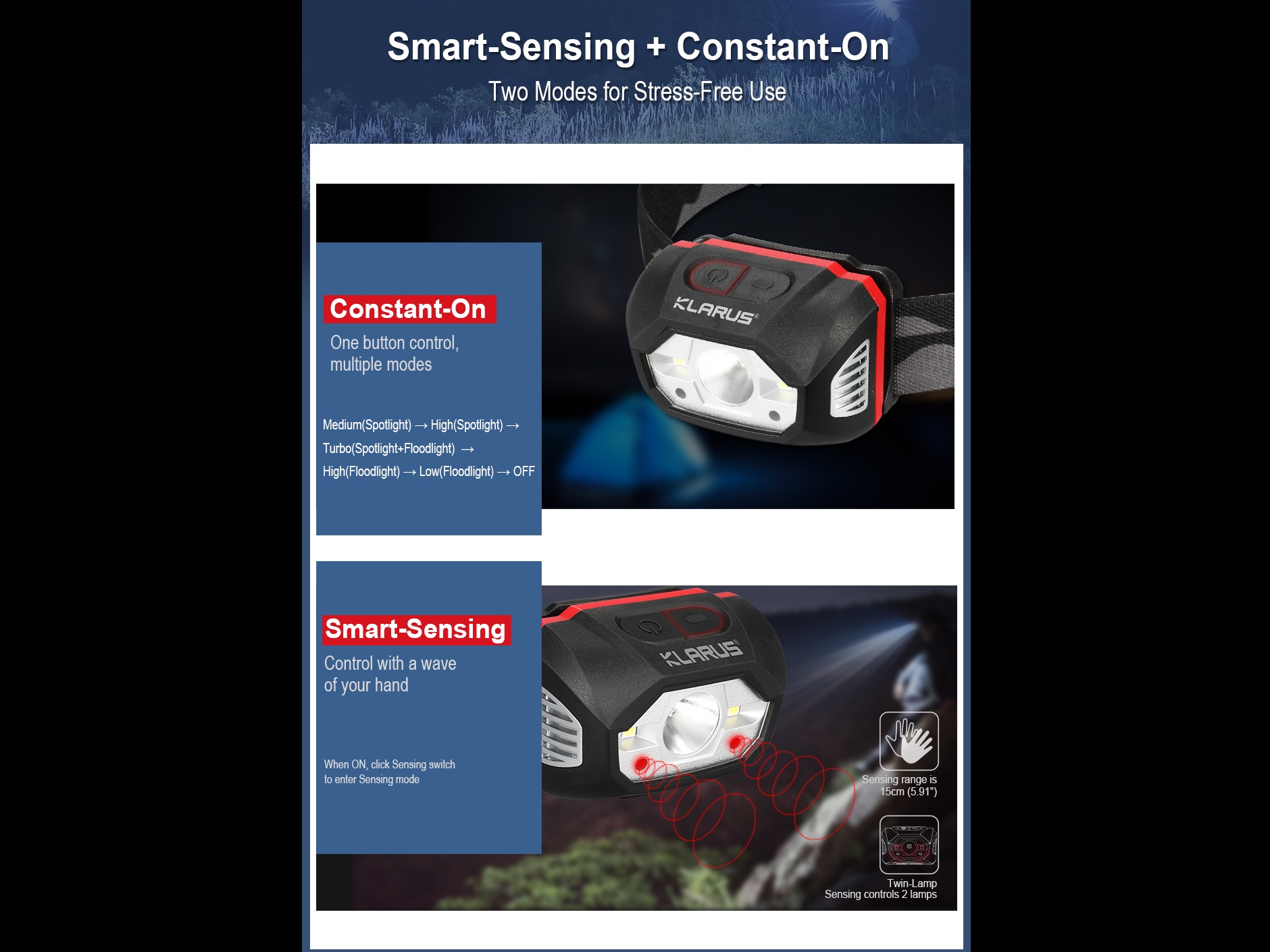 INTELIGENTNÝ SYSTÉM OVLÁDANIA SENZORA: Dva revolučné režimy ovládania pre intuitívne používanie. Tlačidlo MODE sa spustí v strednom režime (Reflektor) a potom sa postupnými kliknutiami do 3 sekúnd prepína medzi 5 úrovňami jasu: Stredný (Reflektor) → Vysoký (Reflektor) → Turbo (Reflektor + Reflektor) → Vysoký (Reflektor) → Nízky (Reflektor) → VYPNUTÉ. Kliknutím na tlačidlo MODE po 3 sekundách sa svetlo vypne bez ohľadu na aktívny režim. Špeciálne senzorové tlačidlo aktivuje/deaktivuje detekciu pohybu gestami s optimálnou detekčnou vzdialenosťou 7 – 15 cm: po aktivácii jednoduchý pohyb ruky pred senzorom okamžite zapne alebo vypne svetlomet – exkluzívna funkcia, ktorá radikálne mení používateľský zážitok v situáciách, keď máte ruky zaneprázdnené alebo v rukaviciach.