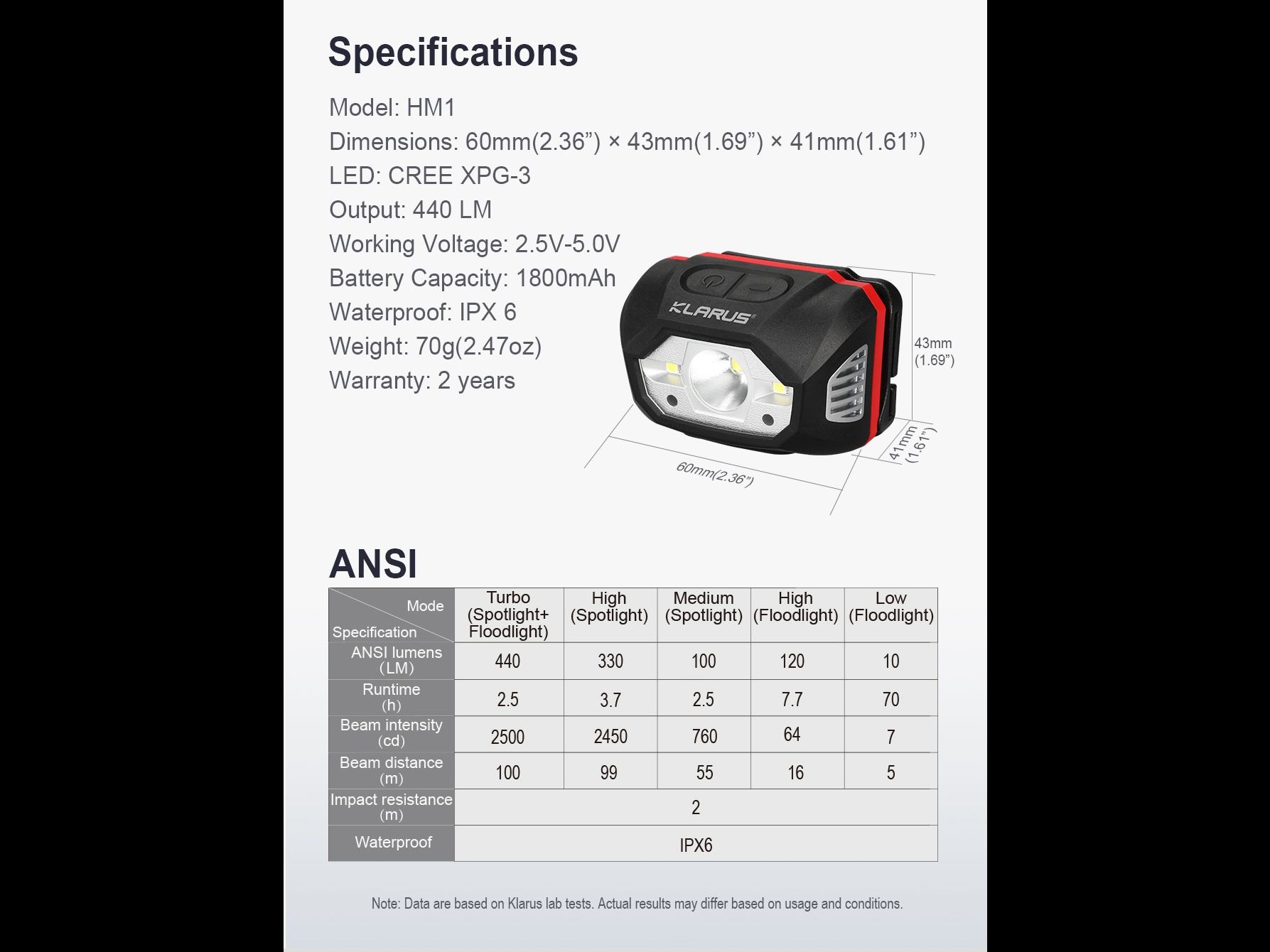 Čelovka Klarus HM1 je vybavená vysoko výkonnou LED diódou CREE XPG-3 a poskytuje intenzitu svetla 440 ANSI lúmenov s dosahom lúča 100 metrov a intenzitou lúča 2500 kandel. Jej hybridný systém osvetlenia Spotlight + Floodlight vám umožňuje presne prispôsobiť svetelnú zónu vašim potrebám. 5 regulovaných režimov osvetlenia (Turbo reflektor + svetlomet 440 lúmenov, Vysoký reflektor 330 lúmenov, Stredný reflektor 100 lúmenov, Vysoký svetlomet 120 lúmenov, Nízky svetlomet 10 lúmenov) sa prispôsobí každej situácii, od intenzívneho nočného behu až po dlhé nočné rybolovy alebo autonómne kempovanie. Integrovaná lítium-polymérová batéria s kapacitou 1800 mAh zaisťuje výnimočnú dobu prevádzky až 70 hodín v úspornom režime, zatiaľ čo režim Turbo udržiava 440 lúmenov nepretržite 2,5 hodiny.