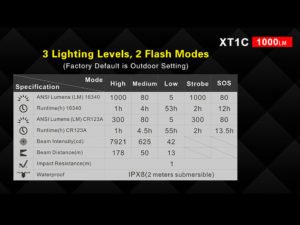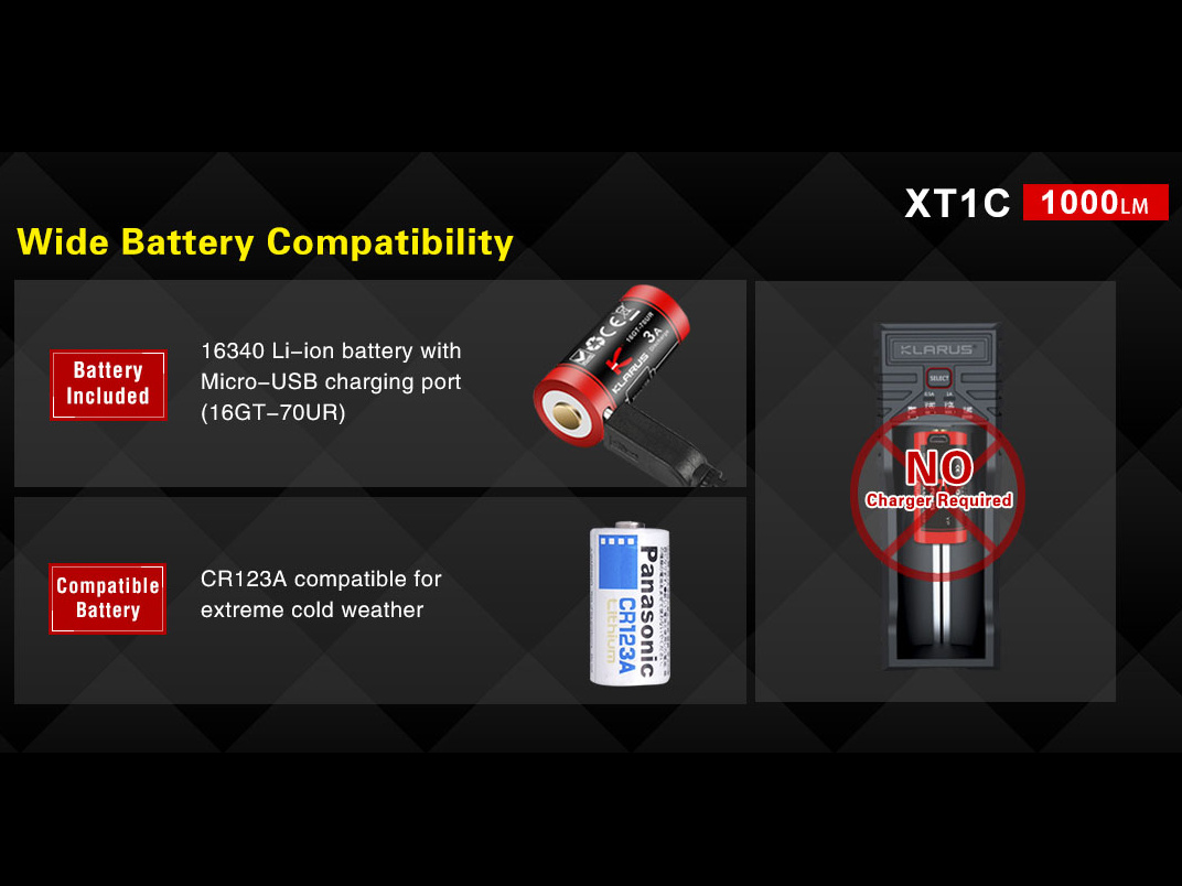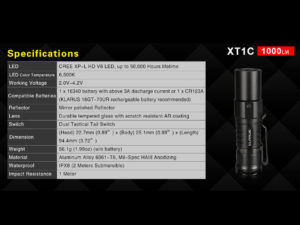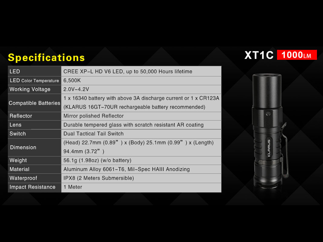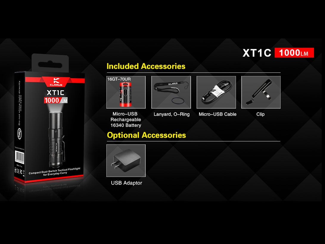 Súčasťou balenia je: Svietidlo XT1C, šnúrka na zápästie, O-krúžky – 1ks, spona, Klarus 16340 700mAh batéria.