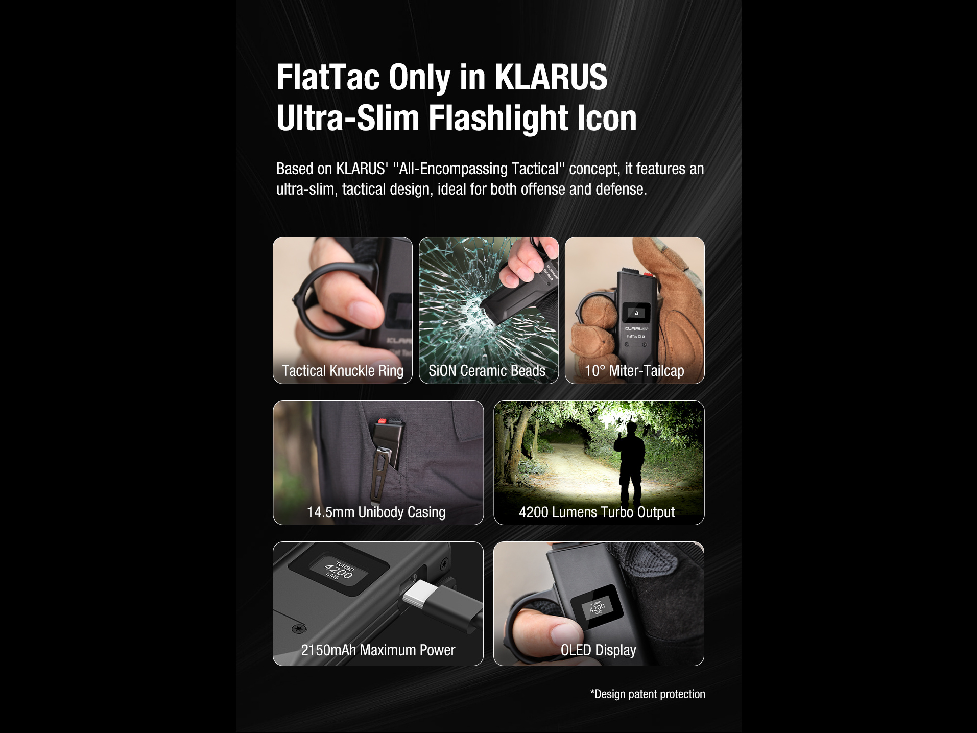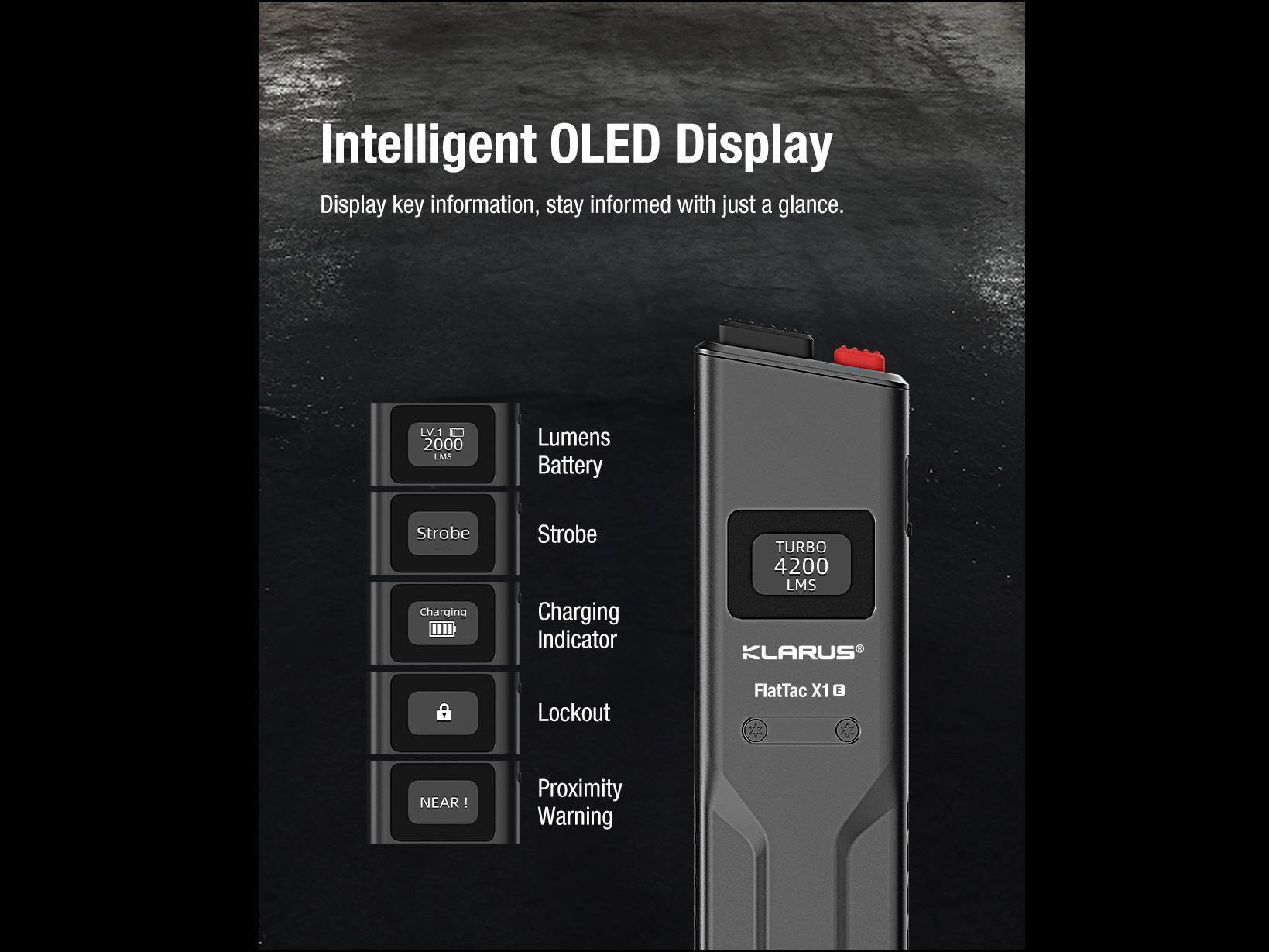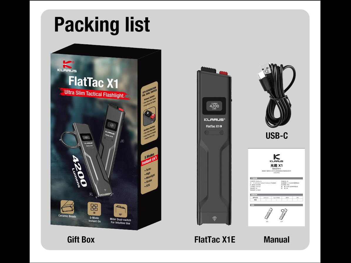 Taktické svietidlo Klarus X1E Ultra Slim, výkonné taktické tenké svietidlo s výkonom 4200 lúmenov v turbo režime po dobu 15 sekúnd, ktoré osvetľuje všetky taktické oblasti a predchádza nebezpečenstvu.