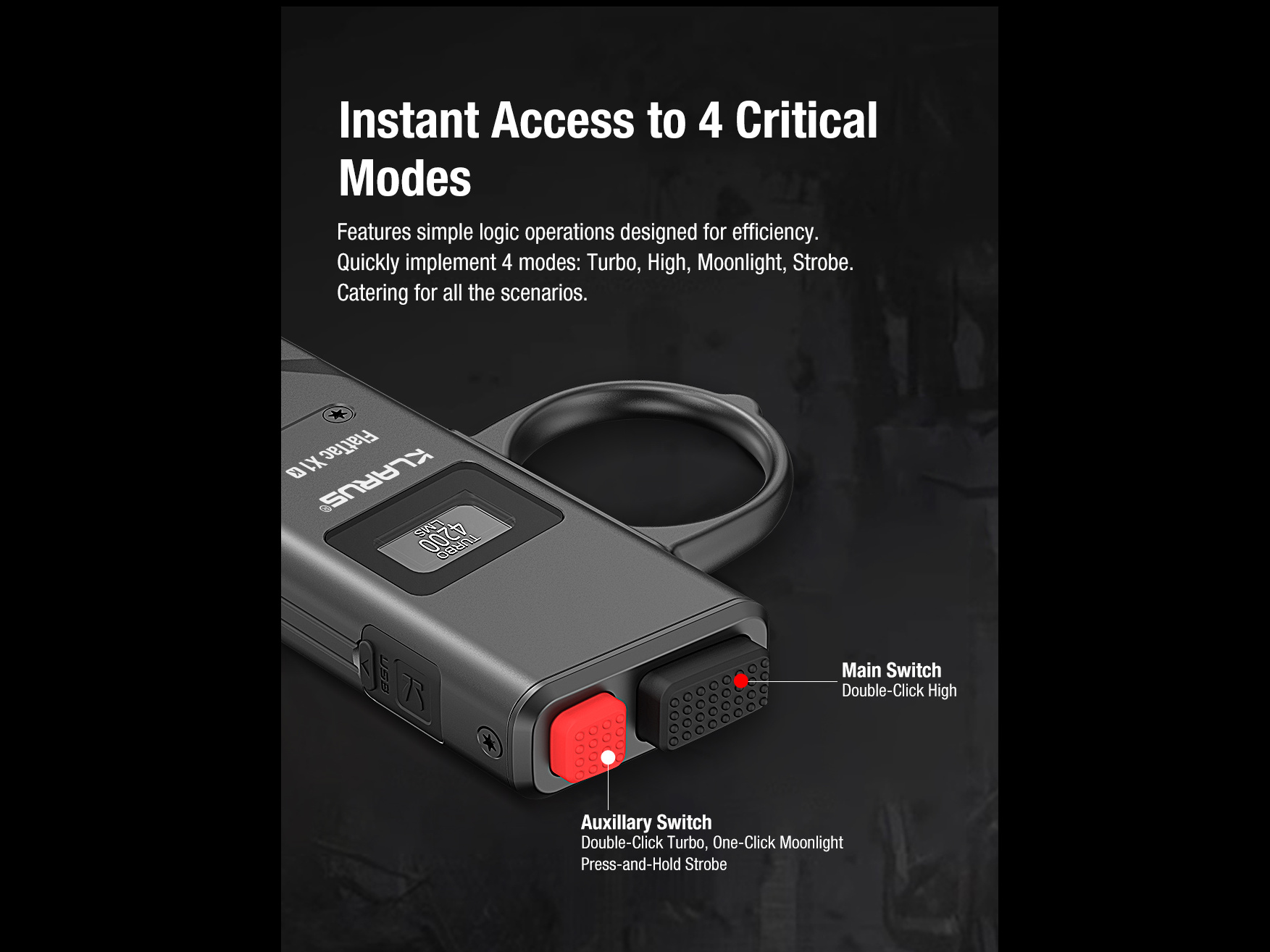 Zadný vypínač pre okamžitú aktiváciu a režim Turbo a druhé červené zadné tlačidlo pre zvýšenie alebo zníženie intenzity alebo výber režimov mesačného svitu, Stroboskopu a SOS.