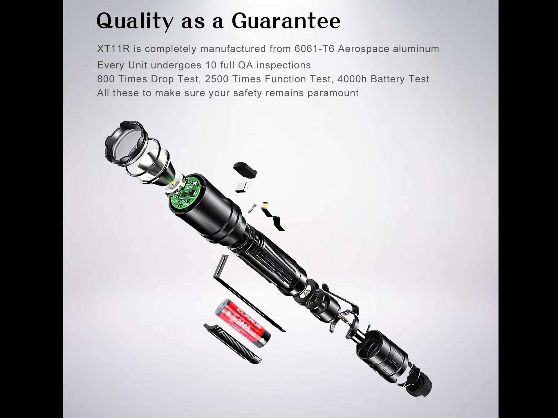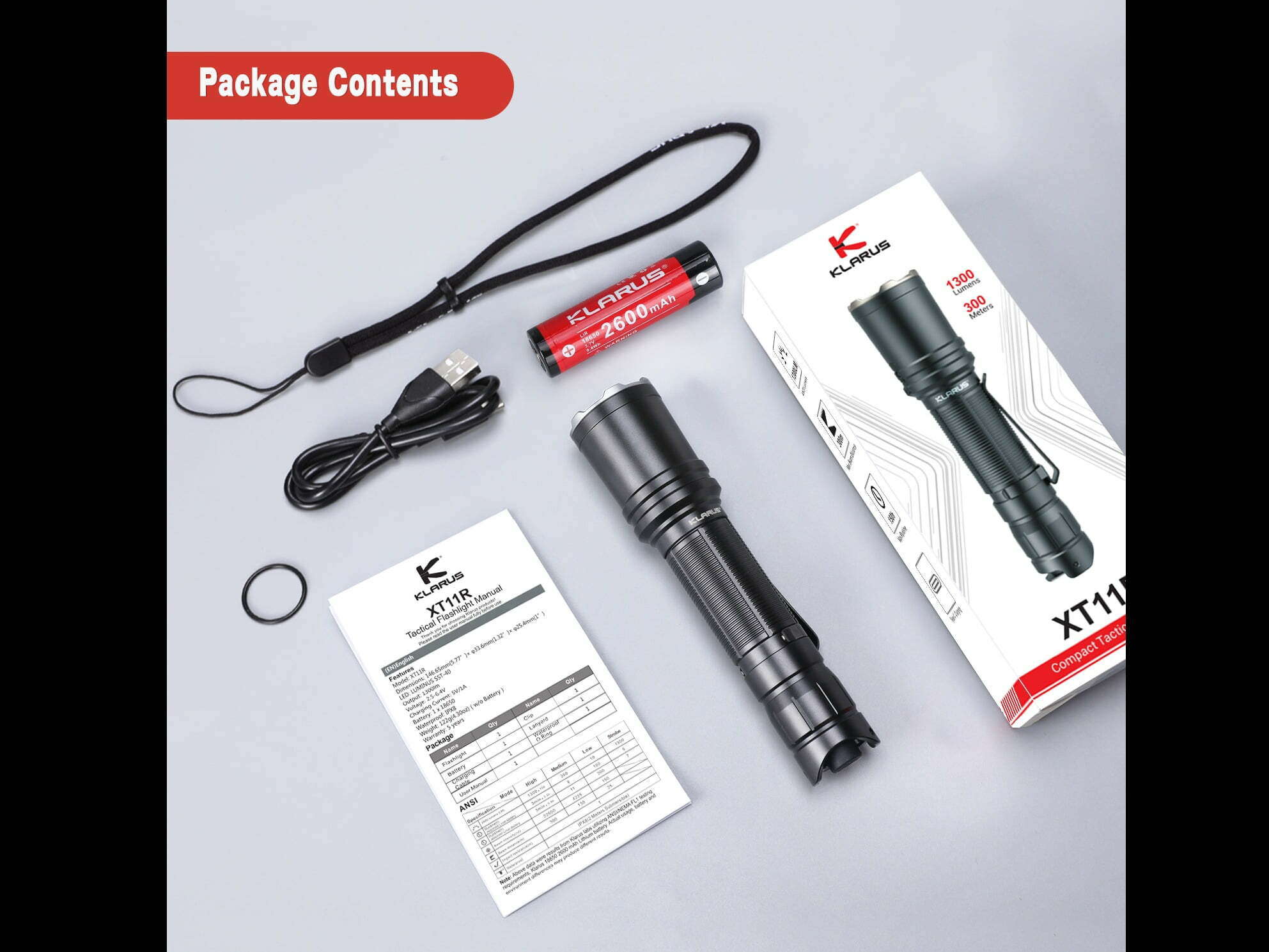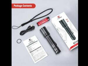 Súčasťou balenia je: Svietidlo XT11R, šnúrka na zápästie, Klip na opasok, na svietidlo, O-krúžky – 2ks, Klarus 18650BAT-26 (LiR 3,7V 2600mAh nabíjateľná), USB nabíjací kábel.