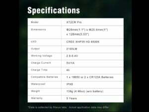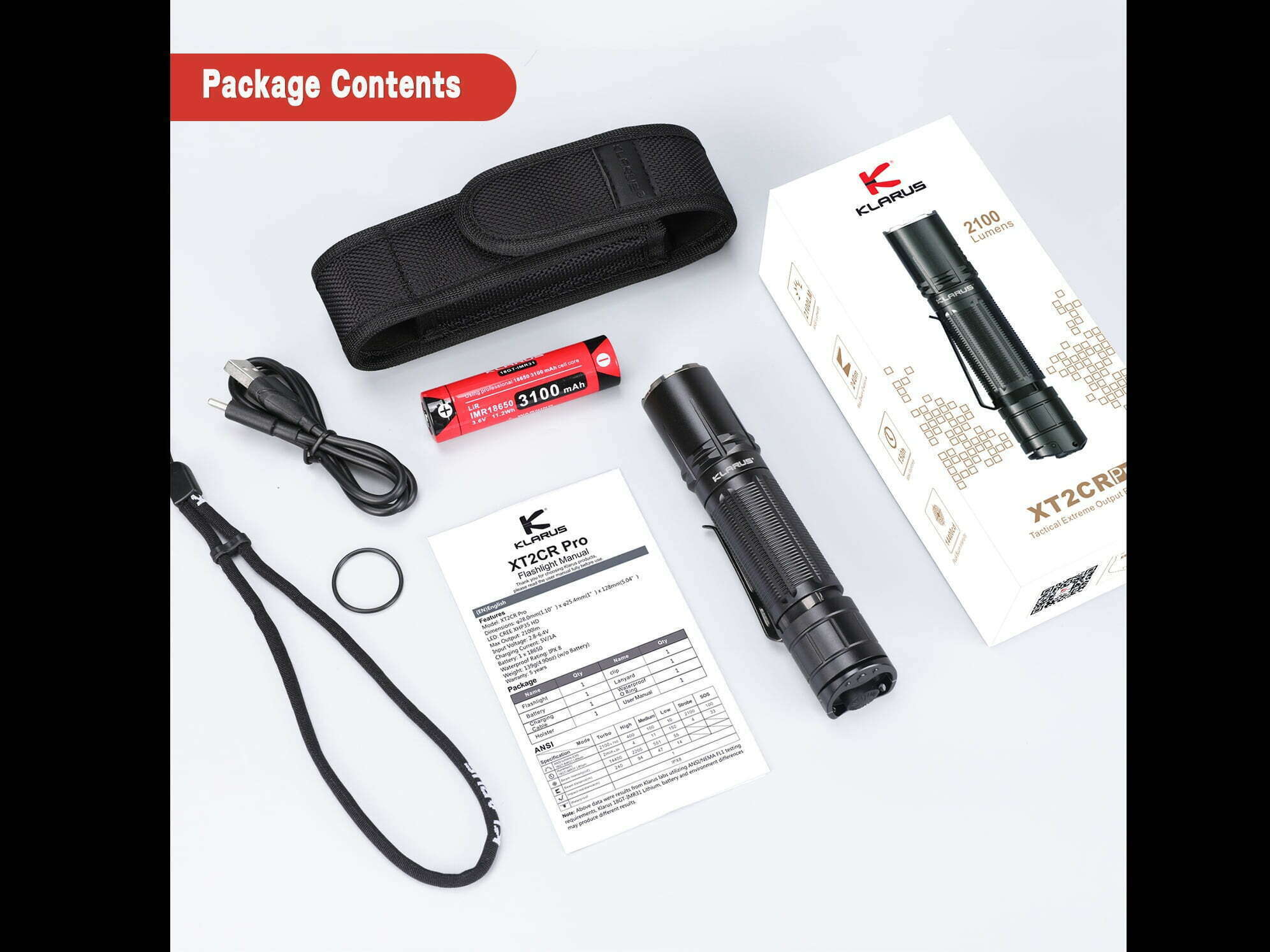 Súčasťou balenia je: Svietidlo XT2CR PRO, šnúrka na zápästie, puzdro na svietidlo, O-krúžky – 1ks, Klarus 18GT-IMR31 (LiR 18650 3,6V 3100mAh nabíjateľná) – 1ks, USB nabíjací kábel.