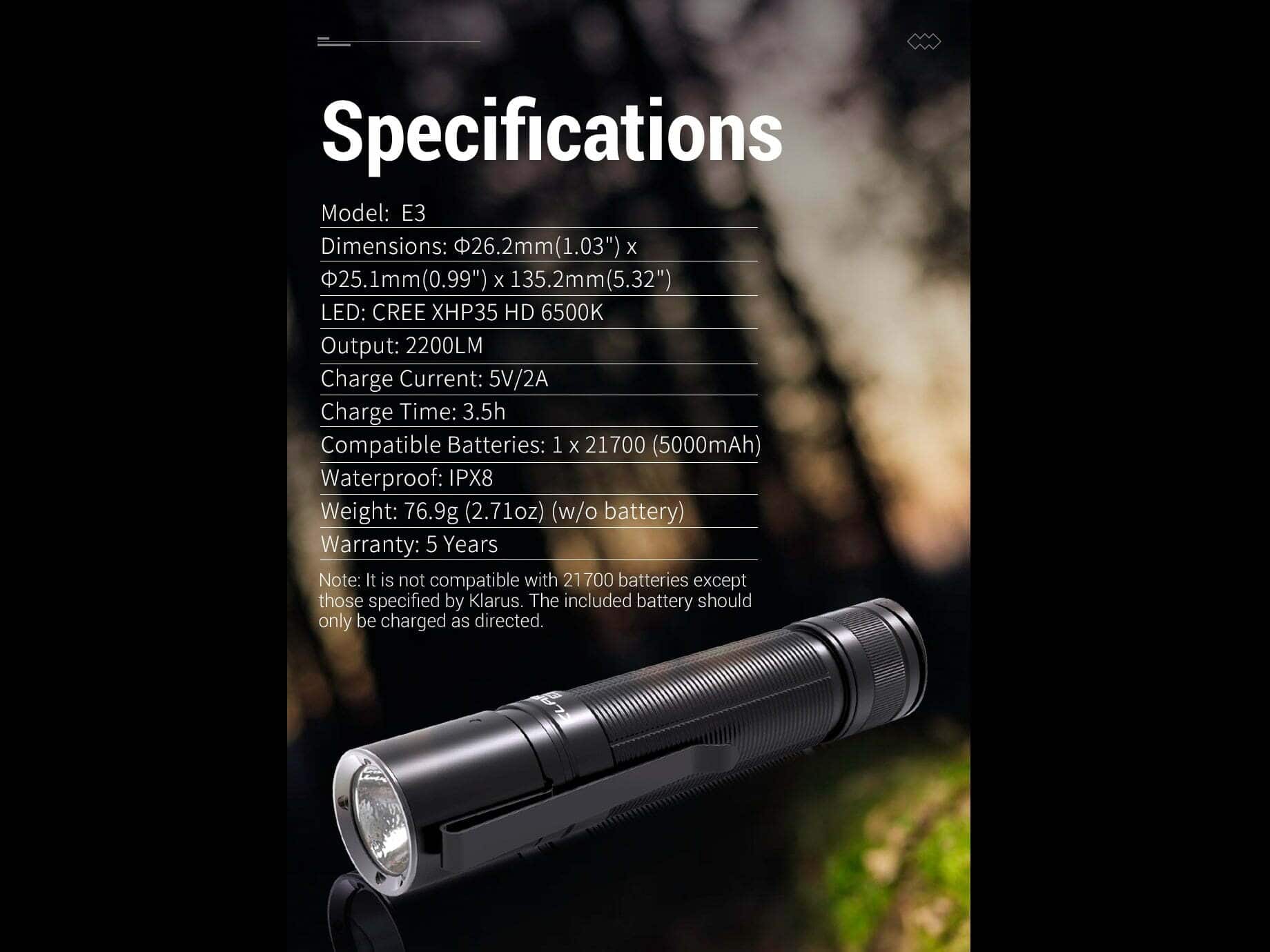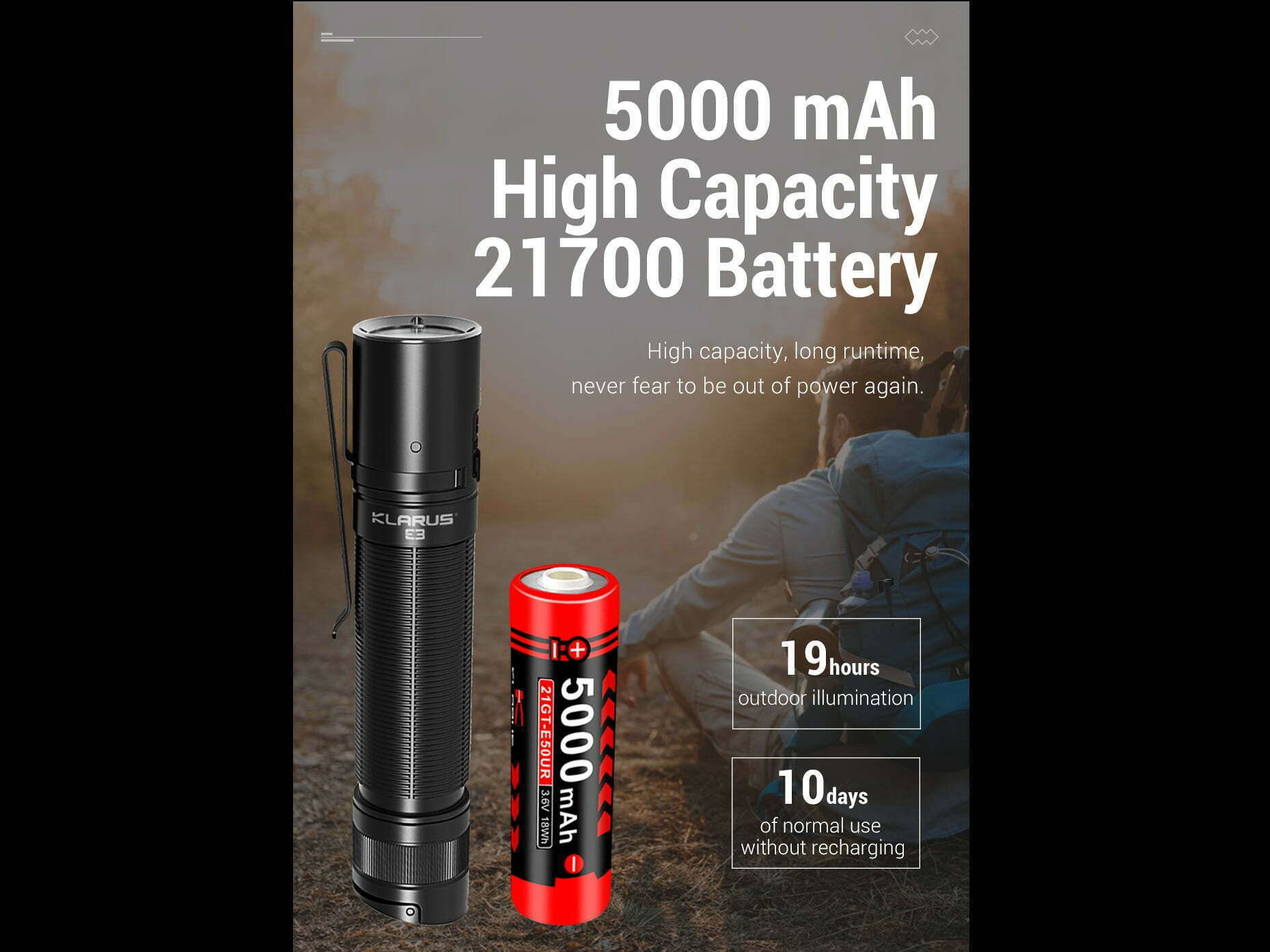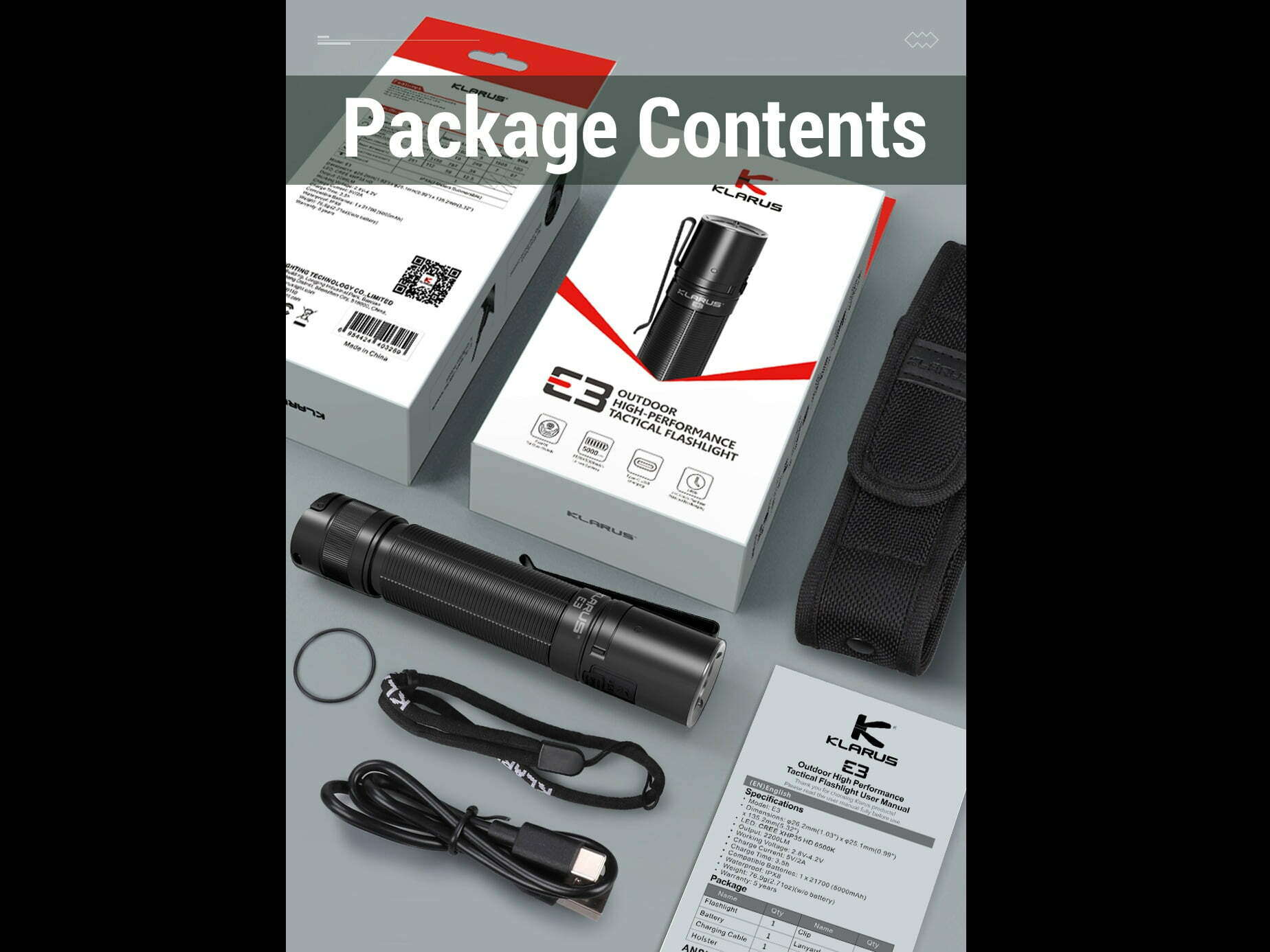 Súčasťou balenia je: Svietidlo E3, Puzdro na svietidlo, USB nabíjací kábel, O-krúžok, šnúrka na zápästie, Klip na opasok, 1x KLARUS batéria 21GT-E50 (LiR 21700 3,6V 5000mAh nabíjateľná „+/-„ na jednom konci).