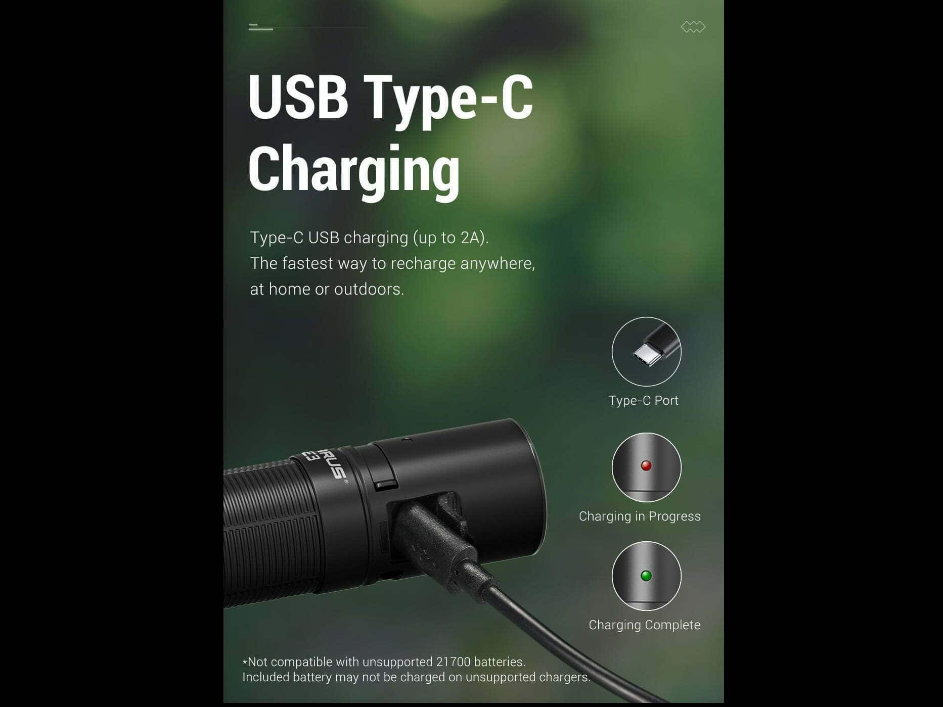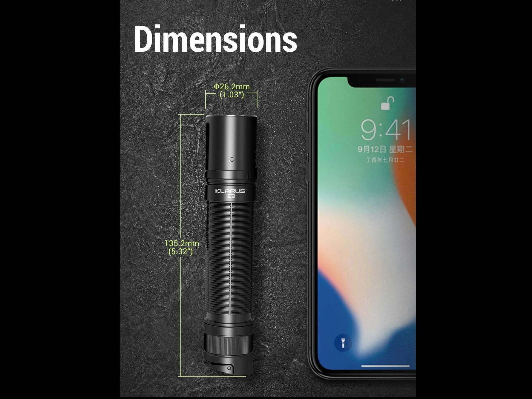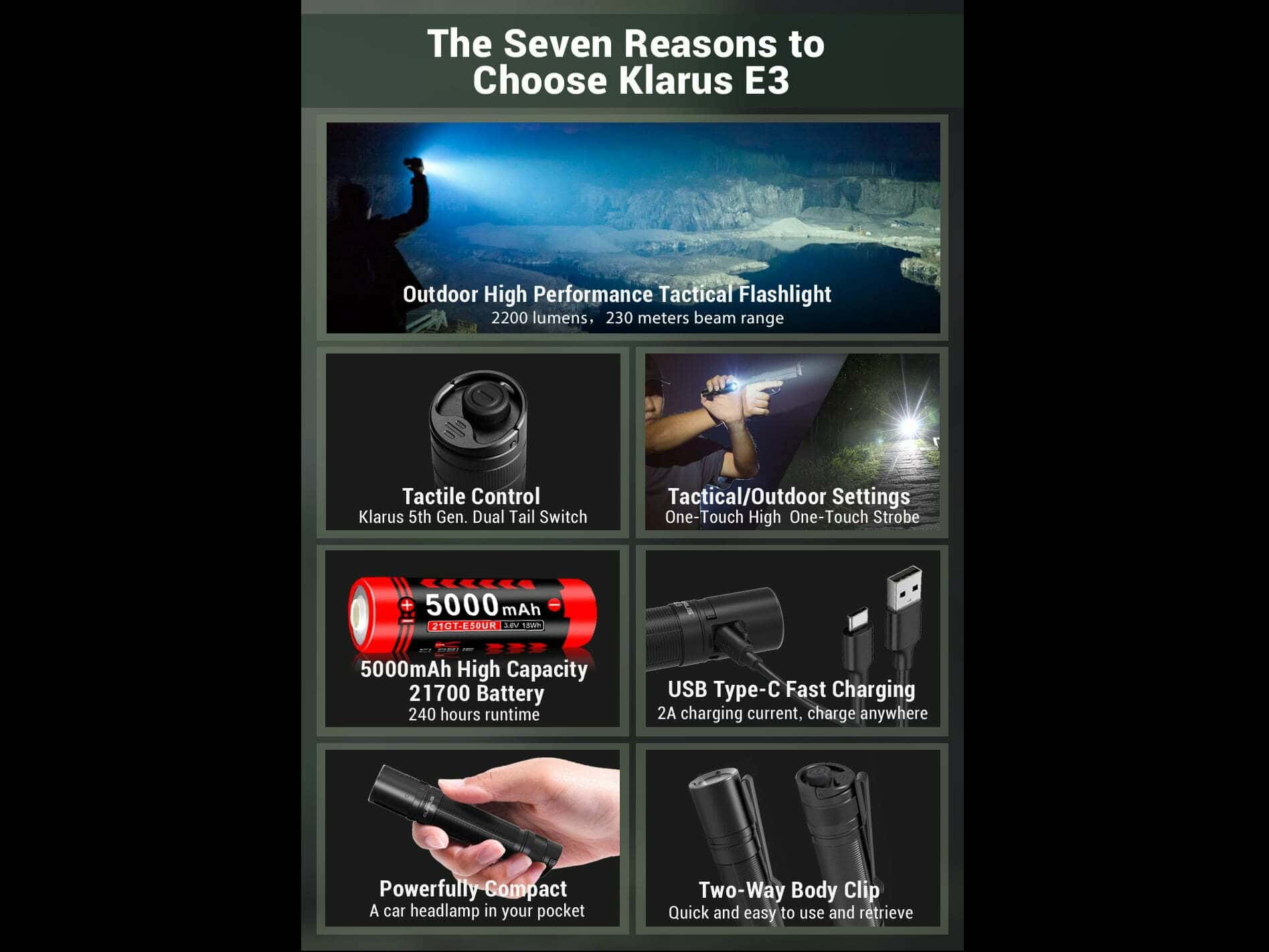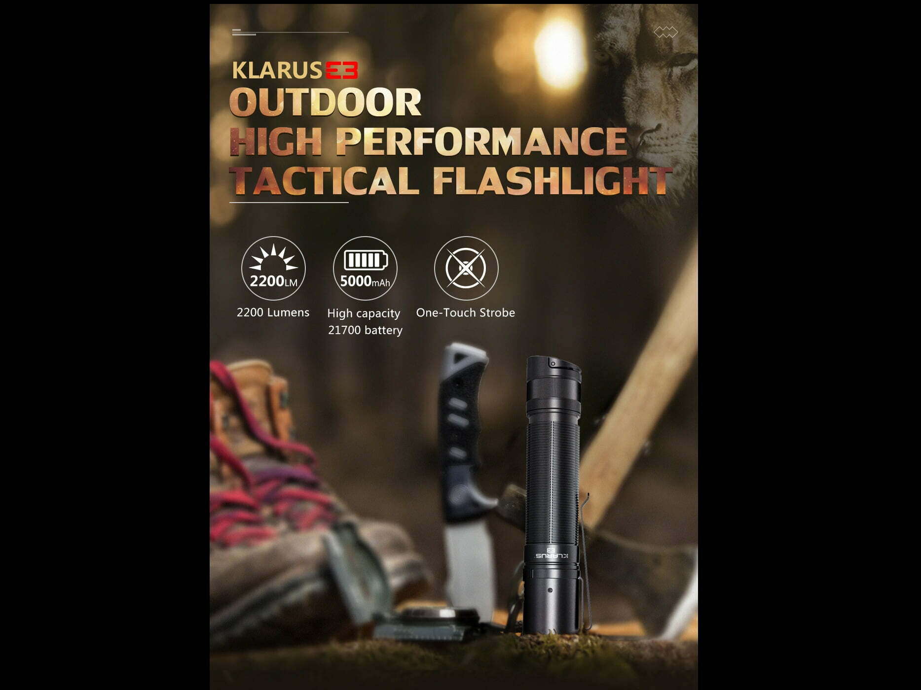 Súčasťou balenia je: Svietidlo E3, Puzdro na svietidlo, USB nabíjací kábel, O-krúžok, šnúrka na zápästie, Klip na opasok, 1x KLARUS batéria 21GT-E50 (LiR 21700 3,6V 5000mAh nabíjateľná „+/-„ na jednom konci).
