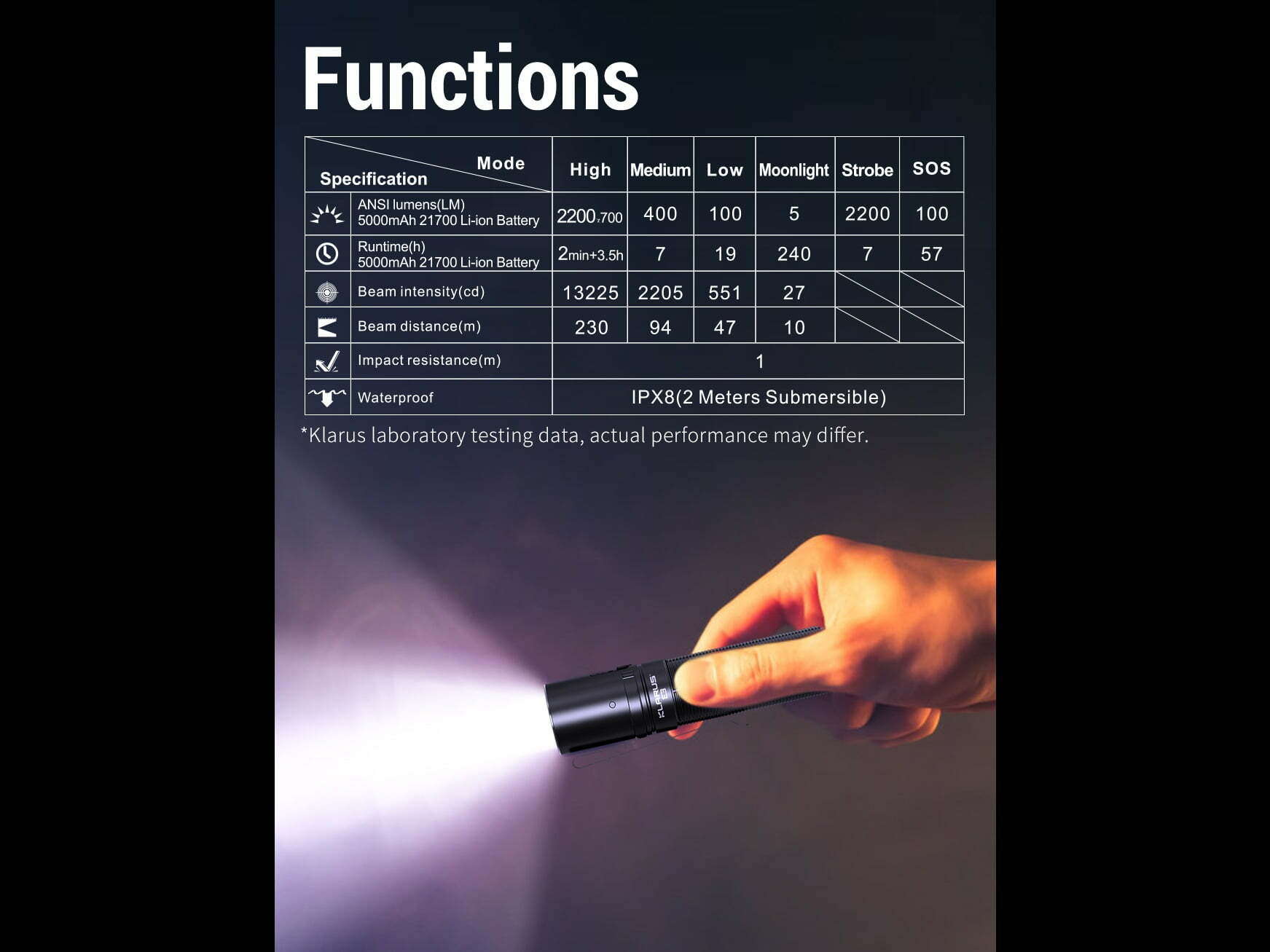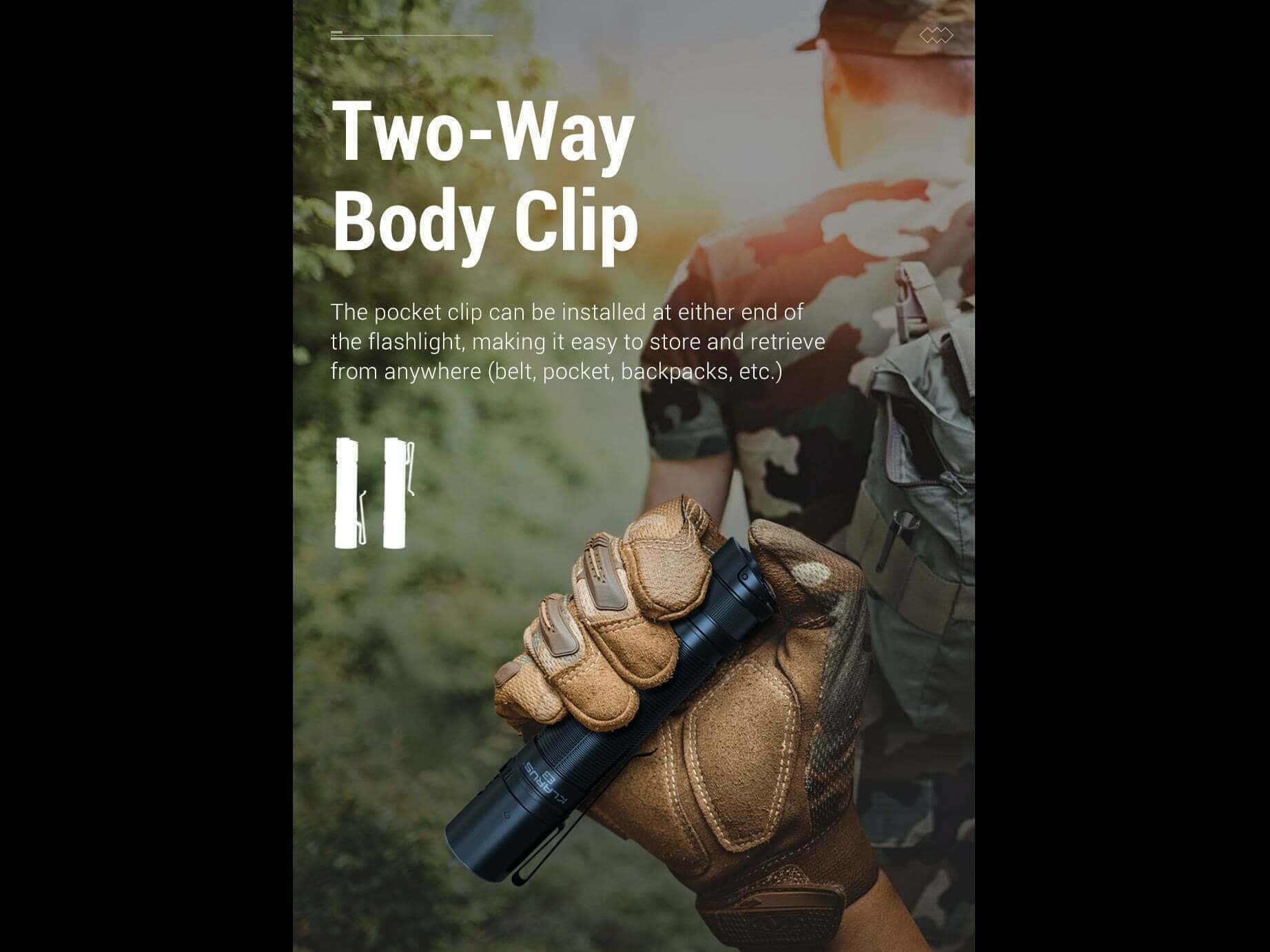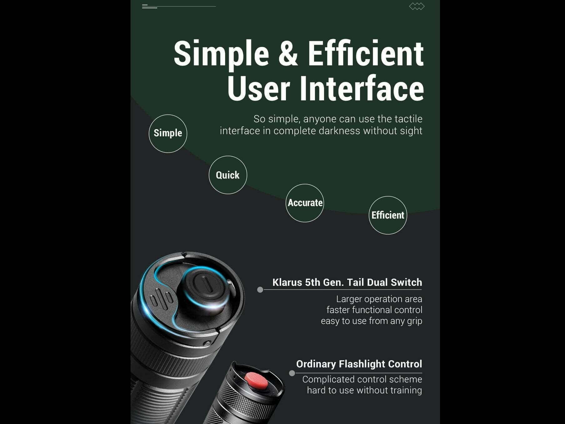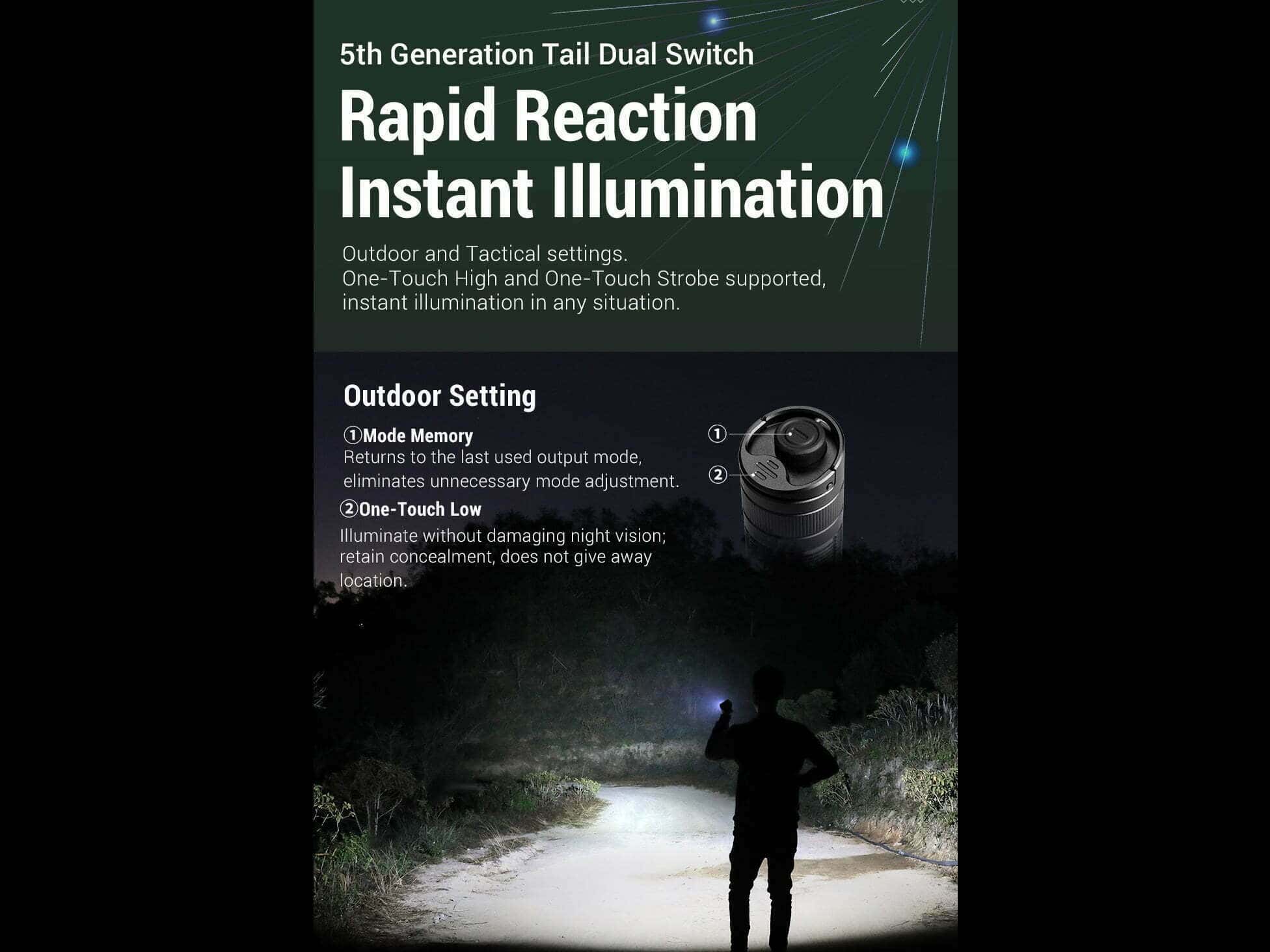 ◇ Taktické nastavenie: Špeciálne navrhnuté pre použitie v sebaobrane a na taktické využitie. Klasické ovládanie Klarus XT série, Jedným dotykom Strobo, Jedným dotykom Vysoký režim, jednoduchá a plná obsluha v akomkoľvek prostredí alebo situácii.
